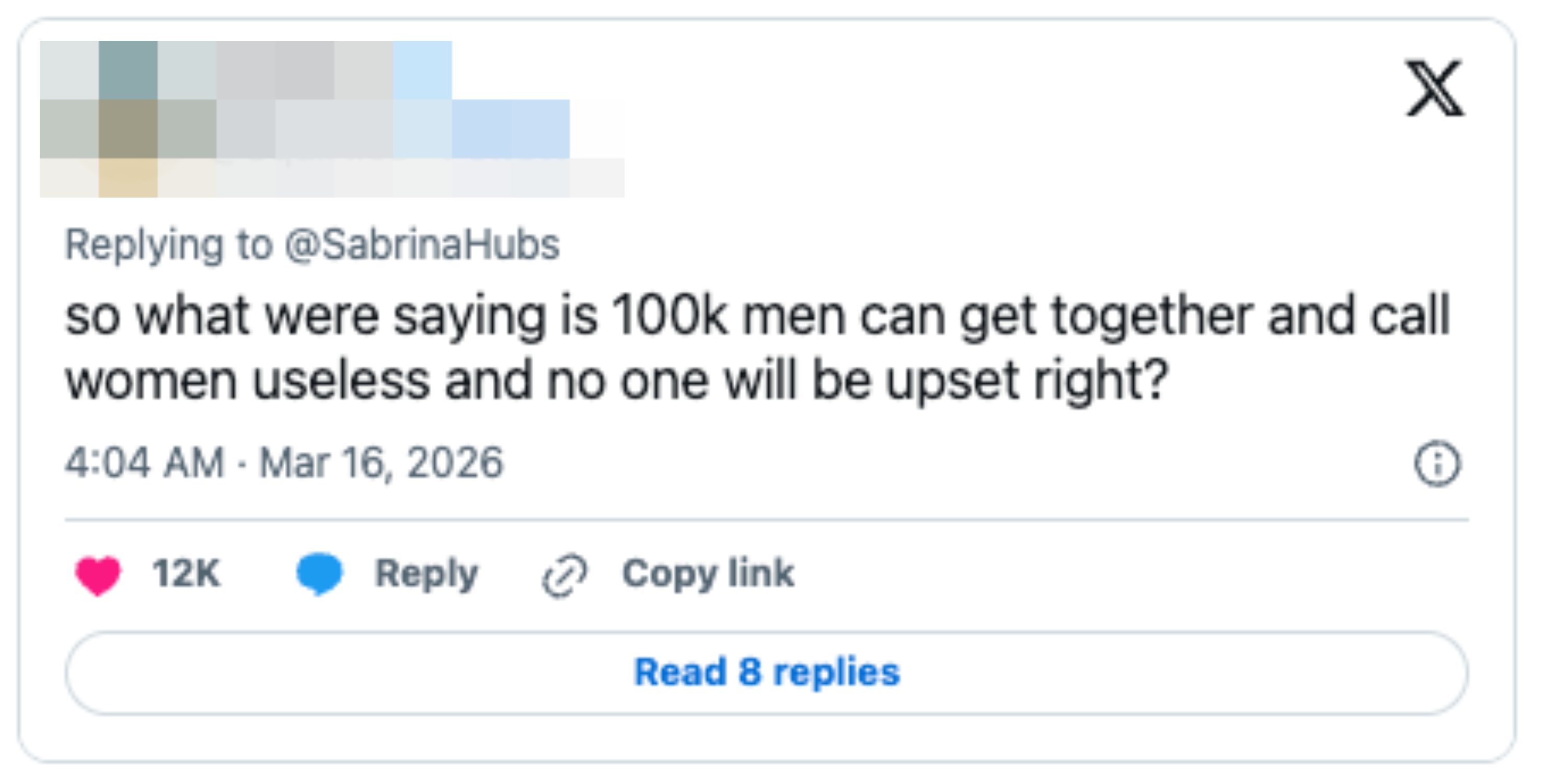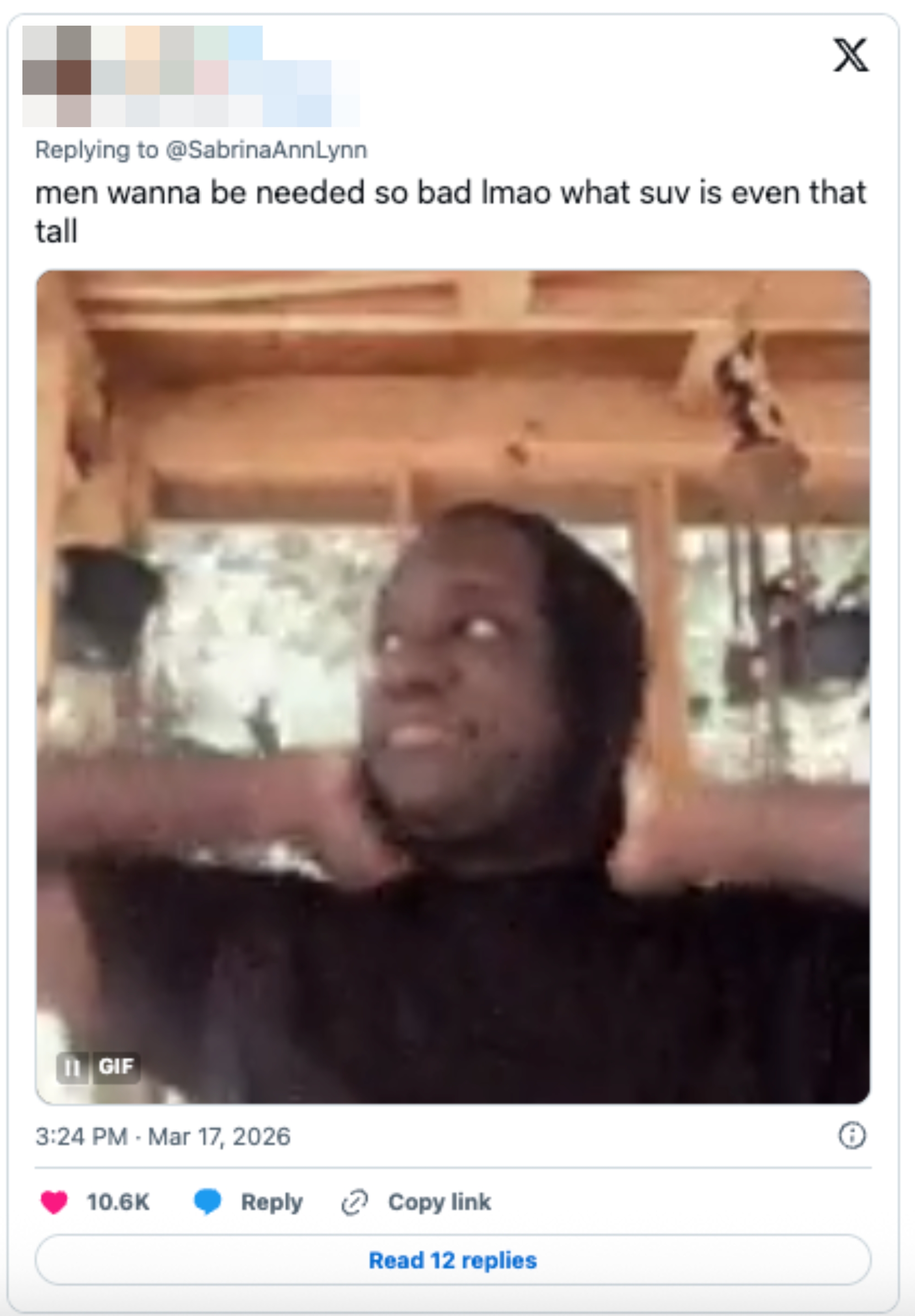 "Why does a woman existing confidently trigger this much resentment?" If you must know, I based my entire personality on Seasons 2-5 of "Girls," and I'm a huge gamer. "Even if she couldn't, a stepladder never gaslighted or hit anyone because it felt insecure," u/skylerren wrote. "I always think it's funny that the only thing these guys can even imagine a woman might want them for is like reaching high things and opening jars. Like deep down, they know they have nothing else to offer," u/ZucchiniJust4666 added. u/Icy-Cockroach4515 said, "Even if Sabrina couldn't get in without help all she'll need is a slightly taller woman. There is nothing in that comment that proves men aren't useless unless the mid-sized SUV in question needs to scan someone's penis before opening the door as a security measure or something." "i find it so weird that these men justify their usefulness by saying they can do menial tasks that can easily be done without them like isn’t it a bit demeaning to say that all you do are things like opening jars or whatever," u/NoMoreSkiingAllowed wrote.