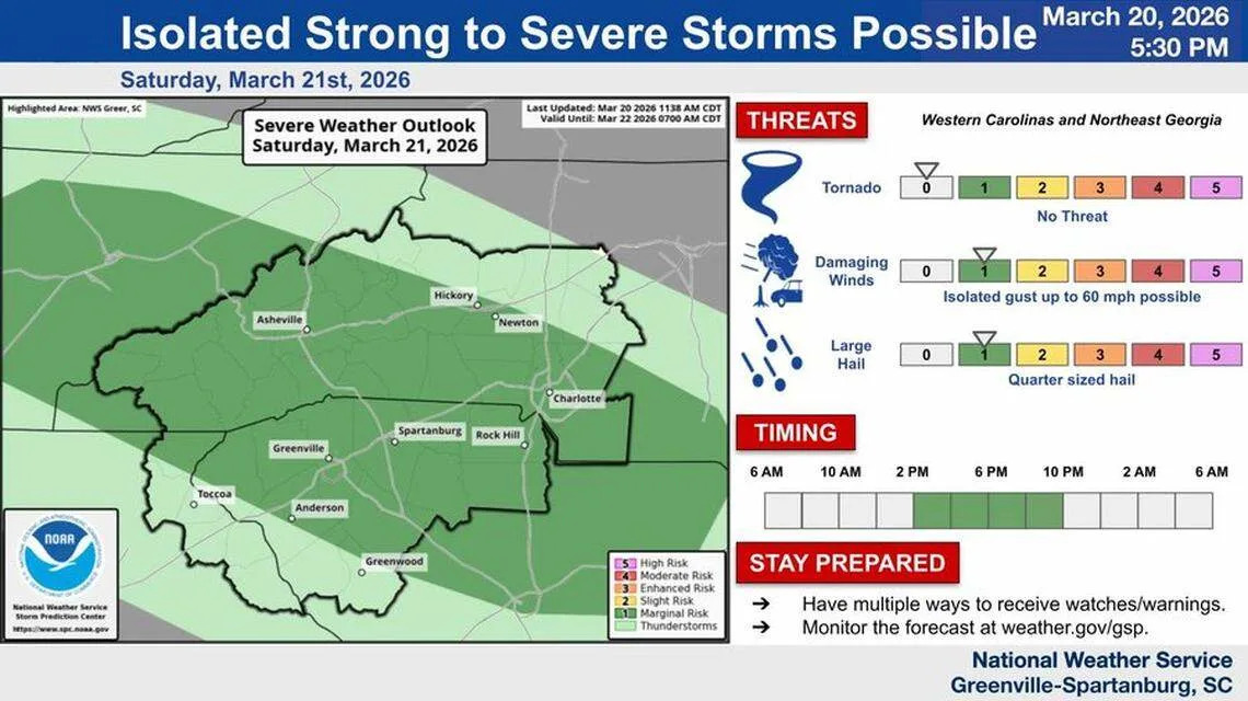 Robbinsville, Lake Santeetlah and Fontana Village in Western N.C. faced the threats of 40-mph winds and pea-sized hail until 8:15 p.m., and Shelby, Forest City and Boiling Springs until 9:15 p.m., according to NWS alerts.