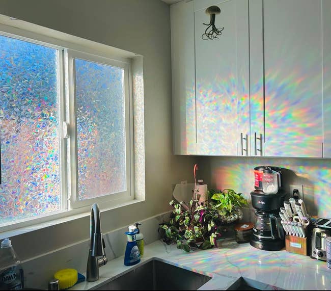 Promising review: "I had no privacy in the evenings and was looking for an alternative solution that was not only effective but that would look good, too. After putting these up, I finally have some really effective privacy. It's so nice without everybody being able to see into my windows whenever they please at night. The amazing amount of rainbow effect that happens during the daytime when the sunlight streams through is so neat! My place is flooded with rainbows everywhere. It is better than I pictured!" —Sally Skeleton
