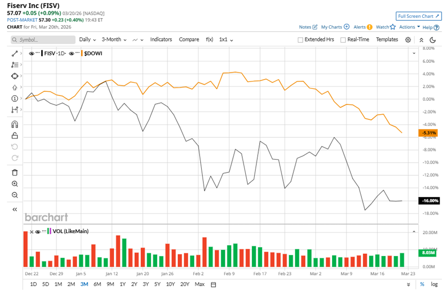 Milwaukee, Wisconsin-based Fiserv, Inc. (FISV) provides payments and financial technology services. Valued at $30.5 billion by market cap, the company provides solutions for customer deposit and loan accounts, digital banking, financial and risk management. FISV also manages card processing, cardless ATM services, and non-card digital payment solutions for financial institutions and corporate clients. Companies worth $10 billion or more are generally described as “large-cap stocks,” and FISV perfectly fits that description, with its market cap exceeding this mark, underscoring its size, influence, and dominance within the information technology services industry. Fiserv's strengths include its innovative tech solutions, strong brand, and loyal customer base. Its focus on quality, security, and service reliability drives client trust and satisfaction. Micron Technology Hikes Its Dividend 30% Due to Surging FCF - MU Is Worth 34% More - What's the Best Play? As Trump Admin Warns on Airport Closures, Should You Sell Delta Airlines Stock? Iran War, Oil Volatility and Other Key Things to Watch This Week Get exclusive insights with the FREE Barchart Brief newsletter. Subscribe now for quick, incisive midday market analysis you won't find anywhere else. Despite its notable strength, FISV slipped 74.9% from its 52-week high of $227, achieved on Apr. 2, 2025. Over the past three months, FISV stock declined 16%, underperforming the Dow Jones Industrials Average’s ($DOWI) 5.3% dip during the same time frame. Shares of FISV fell 56.7% on a six-month basis and dipped 74.3% over the past 52 weeks, significantly underperforming DOWI’s six-month 1.6% losses and 8.6% returns over the last year. To confirm the bearish trend, FISV has been trading below its 200-day moving average since late April, 2025. The stock has been trading below its 50-day moving average over the past year, with minor fluctuations. On Feb. 10, FISV shares closed up more than 4% after reporting its Q4 results. Its adjusted EPS of $1.99 beat Wall Street expectations of $1.90. The company’s adjusted revenue was $4.9 billion, missing Wall Street forecasts of $5 billion. FISV expects full-year adjusted EPS in the range of $8 to $8.30. In the competitive arena of information technology services, Fidelity National Information Services, Inc. (FIS) has taken the lead over FISV, with 33.1% losses over the past 52 weeks and a 23.5% downtick on a six-month basis. Wall Street analysts are cautious on FISV’s prospects. The stock has a consensus “Hold” rating from the 34 analysts covering it, and the mean price target of $74.12 suggests a potential upside of 29.9% from current price levels. On the date of publication, Neha Panjwani did not have (either directly or indirectly) positions in any of the securities mentioned in this article. All information and data in this article is solely for informational purposes. This article was originally published on Barchart.com