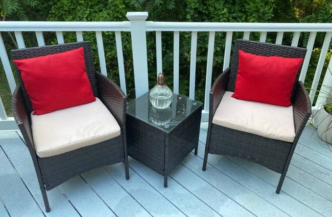 Promising review: "Put this whole set together myself in about two hours — clear instructions and well-organized packaging of the different tools/pieces. I've bought a similar-looking (but cheaper) porch set in the past and was disappointed with the quality of the cushions — I was worried that this set would have the same problem, but I was wrong! The cushions are VERY comfy, and the chair is wide enough for me to comfortably sit crisscross! Absolutely worth the investment!!!" —Katie Swimmer