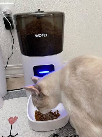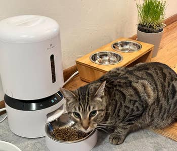 We hope you love our recommendations! While every product is independently chosen by our editors, BuzzFeed and our publishing partners may collect a share of sales or other compensation from the links on this page. You can read more about how our affiliate partnerships work in our Editorial Standards & Ethics Guide. Picture this: Your kitty will no longer wake you up before dawn screaming for food *and* they'll be fed when you leave home for more than a few hours. Shopping for the light of your life (aka your cat) can be challenging, especially when you want a product you can trust to function properly and feed them on time. Cats have vastly different needs, so automatic cat feeders are not a one-size-fits-all item. There are Wi-Fi devices that work with a smartphone app, feeders with built-in cameras, ones that are specifically designed for wet food, and more. Rest assured, you'll get your money's worth with an automatic cat feeder that takes care of meal time for you. What's better than an investment both you *and* your kitto will benefit from? The 5-liter model can store up to a whopping 5 pounds of food, which means you won't have to refill it as often. You can even program their mealtimes directly from the smartphone app. Dispensing manual feedings is also an option. Best of all, you won't be woken up at the crack of dawn with a four-legged tyrant screaming in your ear. Bless! Psst — It also has a built-in desiccant bag and sealing strip to keep food fresh! Promising reviews: "We are vacationing for a month in Arizona and wanted an automatic feeder for our cat in case our cat sitter couldn’t get to our house. We can add an extra feeding remotely. We are very pleased with our purchase. We can easily adjust the amounts and times of feeding, even from a thousand miles away. When the cat hears the voice say 'mealtime,' she comes running. We are able to control her diet because we aren’t arbitrarily feeding her." —Jan D "I was worried this wouldn't work, but it's extremely simple to use. I have cameras that watch my cats when I'm away, so to test it, I fed my cats through the app and went to view the camera. I can see it feeding them live with no delay. I have it set to a schedule, so even when I'm at home, my cats don't wake me up at 5 a.m. demanding to be fed. And I know it's working because I can hear it go off every day at the scheduled time." —s a Get it from Amazon for $89.99 (available in two sizes, in black or white, and in a dual-bowl style). This wallet-friendly option has all the bells and whistles you need to keep your feline happy without spending a fortune. It allows you to program up to six feedings per day and can hold nearly 17 cups of dry food in the airtight storage. It allows you to record a 10-second meal call with your voice that plays when a feeding is dispensed. You can also add three backup D batteries to ensure the feeder keeps functioning during power outages. Bonus: The dishwasher-safe hopper *and* bowl can be easily disassembled and cleaned. Promising review: "This is great for me since I get home at different times and can't always be home at feeding time. It's reliable and easy enough to program if you read the instructions. The portions make it so your cats don't overeat — just do some basic measuring and testing with the one-time feed button. If you already feed them from a gravity feeder, then just experiment over a week or two and look up recommended feed amounts for the weight of your animal. Extremely long battery life — I don't even bother plugging mine in, and I don't need to use the voice feature because the sound of the food hitting the bowl sends them running." —high-o silver Get it from Amazon for $39.99+ (available in white or green and in three styles). Using an automatic cat feeder may require more diligence in multi-pet households, especially if any of 'em are on a prescription diet. This is also helpful when you have a food thief on your hands who will try to steal their sibling's leftovers! This feeder pairs with your cat's microchip, so only they can access it. When they walk away, it closes to protect any food they may have left in the dish. Each dish can hold 13.5 ounces of wet or dry food. The lid closes and forms a tight seal, helping retain moisture and keeping food fresher longer. Note: This feeder is compatible with 9-digit (Avid Secure), 10-digit (FDXA), and 15-digit (FDXB) microchip numbers. Check with your vet if you're unsure about your pet's microchip number! BuzzFeed editor Jenae Sitzes says: "I've had my microchip pet feeders from Sure Petcare for a couple of months now, and while it was a pricey investment, it's been worth every single penny and has alleviated a ton of stress around my cat's meals. One of my cats, Sneaky, always wants to eat his brother's food and has a tendency to be overweight. Separating them for meals just wasn't working — they would whine at the door and simply not eat enough unless they could eat side by side and have free access to food throughout the day — but I also couldn't be sure that my younger (and much smaller) cat, Chicho, was eating enough with Sneaky gobbling up part of his meals, too. When my vet started throwing around the word "diabetes" as a very real concern if Sneaky didn't start sticking to controlled diet every day, I knew I needed to finally cough up the money for microchip feeders — I mean, it'd be a drop in the bucket compared to the long-term cost of cat insulin. The setup was ridiculously fast, the open-close function works beautifully, and my cats learned how to use these almost immediately. Finally, Sneaky can *only* eat what's in his feeder, which allows me to control his calorie intake and see exactly how much food he's eating daily — and I can be sure that Chicho is getting *enough* food, too. This is also a fantastic solution if you have cats on different diets due to health reasons, and if one of them starts eating way less for some reason, you'l
