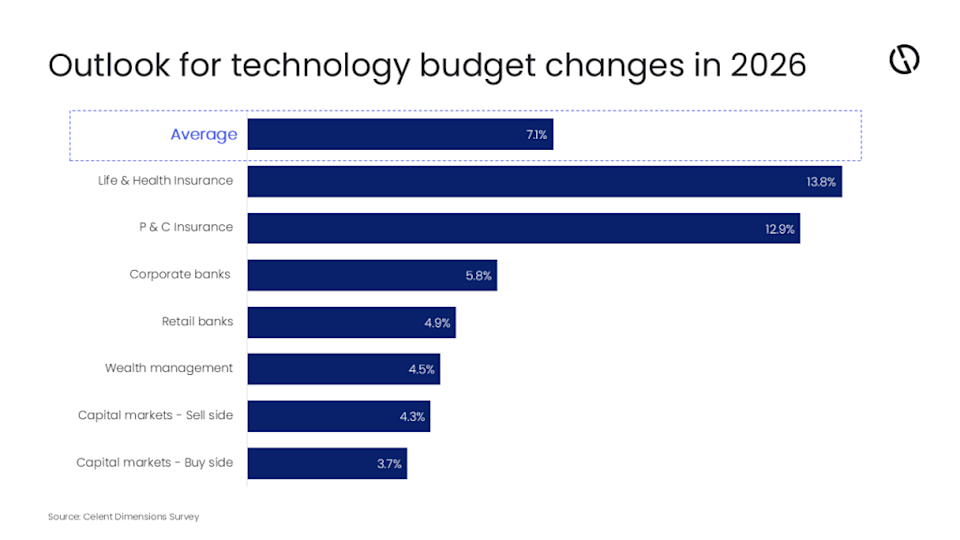 Financial institutions are entering 2026 with competing technology priorities, from scaling artificial intelligence (AI) capabilities and strengthening data governance to modernising legacy systems and managing rising regulatory demands. Celent’s research, based on its comprehensive IT Dimensions survey of more than 1,000 executives at financial institutions, reveals that IT budgets are expected to rise by an average of 7% in 2026 with significant variation across the financial services industry. As a result, institutions across the board are being forced to make tougher decisions about where technology investment will deliver the greatest value. Tom Scales, Principal Analyst at Celent, said: “Budgets are rising, but so are expectations. Choosing the wrong technology bets can have real competitive consequences. It is great to see life and annuity insurers investing and catching up.” Insurance is leading the charge in digital transformation. The biggest expected IT budget rises are expected to surge by 13.8% in life insurance and 12.9% in P&C insurance. Scales added: "Insurers are ramping up their IT spend this year, with many moving from experimenting with innovations to full implementation. Celent expects some real operational impact, with advances in generative and agentic AI, automation, real-time data platforms, and real-time risk monitoring. Not to mention that many insurers are modernising legacy systems." The lowest expected IT budget increases are seen in the capital markets segments, at only 3.7% on the buy side. Cubillas Ding, Capital Markets Research Director at Celent, said: “Buyside firms continue to face pressures from margin compression, and achieving scale remains a defining challenge. The industry is consolidating, but technology and AI enablement remain critical for differentiated strategies that protect profitability, sustain relevance, and deliver tailored investment outcomes. Looking ahead to 2026, Celent expects firms to execute parallel initiatives: operationalise AI while pursuing digital and cloud migrations of core systems.” Closer to the average budgetary increases lie banks, with corporate banks expected to see a 5.8% budget rise. For these companies, there are three factors at play: the very biggest banks are investing huge sums, the vast majority of spend is mandatory (keeping the lights on or regulatory), and the budget available for innovation and change is falling. Gareth Lodge, Principal Analyst at Celent, commented: “Corporate banking IT budgets will continue to grow through 2027 but so will the pressures on them. Many banks will feel as though discretionary spending has tightened further. While new technologies create opportunities, they also raise expectations of what these budgets must deliver. “Each innovation, such as GenAI, adds not only ongoing operational costs but also continuous upgrade requirements. Furthermore, banks must also balance investing in advanced capabilities for sophisticated clients while maintaining legacy systems relied on by existing ones.” "Financial institutions face rising IT budgets as they balance innovation, legacy and regulation: Celent" was originally created and published by Retail Banker International, a GlobalData owned brand. The information on this site has been included in good faith for general informational purposes only. It is not intended to amount to advice on which you should rely, and we give no representation, warranty or guarantee, whether express or implied as to its accuracy or completeness. You must obtain professional or specialist advice before taking, or refraining from, any action on the basis of the content on our site.