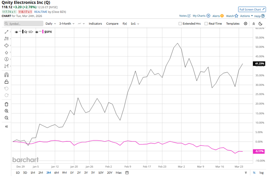 With a market cap of $24.1 billion, Qnity Electronics, Inc. (Q) is a global provider of materials and solutions for the semiconductor and electronics industries, serving regions including the Americas, Europe, Asia Pacific, and beyond. The company operates through two segments: Semiconductor Technologies and Interconnect Solutions. Companies valued at more than $10 billion are generally considered “large-cap” stocks, and Qnity Electronics fits this criterion perfectly. It offers products such as CMP pads and slurries, photoresists, plating solutions, and advanced thermal materials. Stock Index Futures Rally as Oil Prices Tumble on U.S.-Iran Talks Unusual Options Activity Flares in META and SMCI Stock: What to Watch Next Down 12% from Its Highs, Should You Buy the Sandisk Stock Dip? Markets move fast. Keep up by reading our FREE midday Barchart Brief newsletter for exclusive charts, analysis, and headlines. Shares of the Wilmington, Delaware-based company have fallen 19% from its 52-week high of $140.60. Qnity Electronics’ shares have climbed 42.4% over the past three months, exceeding the broader S&P 500 Index’s ($SPX) nearly 5% decline over the same time frame. Q stock is up 45.4% on a YTD basis, outperforming SPX’s 3.8% decrease. The stock has been trading above its 50-day moving average since January. Shares of Qnity Electronics rose 4.1% on Feb. 26 after the company reported strong 2025 results, including full-year net sales of $4.75 billion (up 10%) and adjusted pro forma EPS of $3.35 (up 12%), along with adjusted Operating EBITDA of $1.4 billion (up 11%). Investor sentiment was further boosted by 2026 guidance projecting higher performance, with revenue of $4.97 billion - $5.17 billion, adjusted EPS of $3.55 - $3.95, and EBITDA of $1.47 billion - $1.58 billion. In comparison, rival Entegris, Inc. (ENTG) has lagged behind Q stock. ENTG stock has increased 43.7% on a YTD basis. Due to the stock’s strong performance, analysts remain bullish about its prospects. Q stock has a consensus rating of “Strong Buy” from the nine analysts in coverage, and the mean price target of $140.88 is a premium of 19.5% to current levels. On the date of publication, Sohini Mondal did not have (either directly or indirectly) positions in any of the securities mentioned in this article. All information and data in this article is solely for informational purposes. This article was originally published on Barchart.com