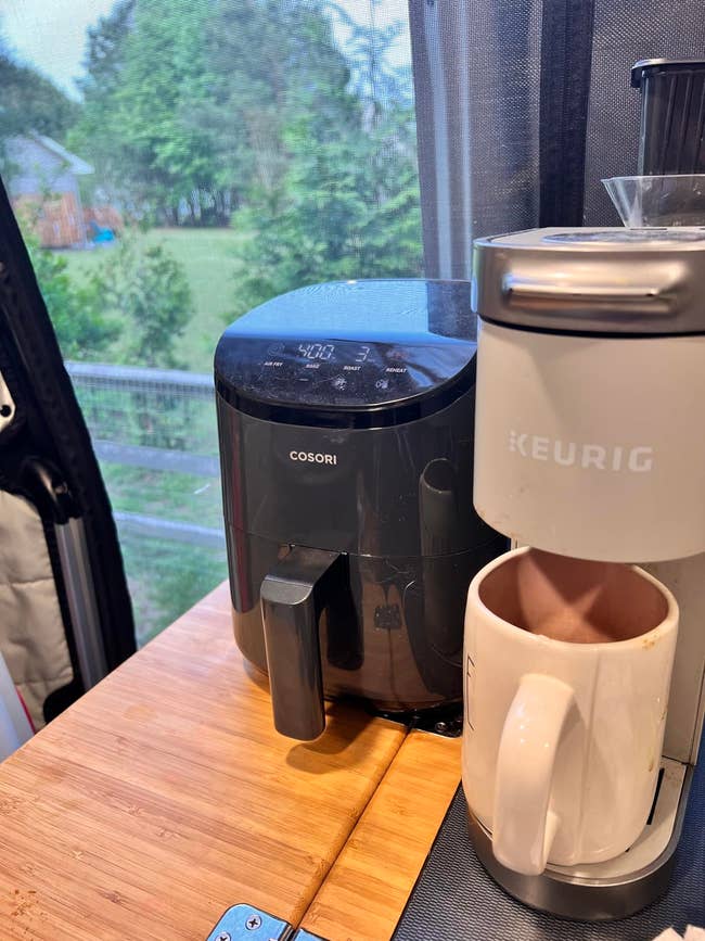 Promising review: "I bought this tiny air fryer to use while camping, but now it has a permanent space in my kitchen, too. I find myself throwing food into it instead of my expensive, gigantic one. So many times, I don't need the whistles and bells overkill of the big one. If you live alone or have a household of 1–2, and don't expect to cook a 5-pound anything in it, it's perfect and packed with the quality I expected from Cosori. (It also blew my camping buddies away when hot rolls hit the table on my night to make chili...lol)" —Cheri