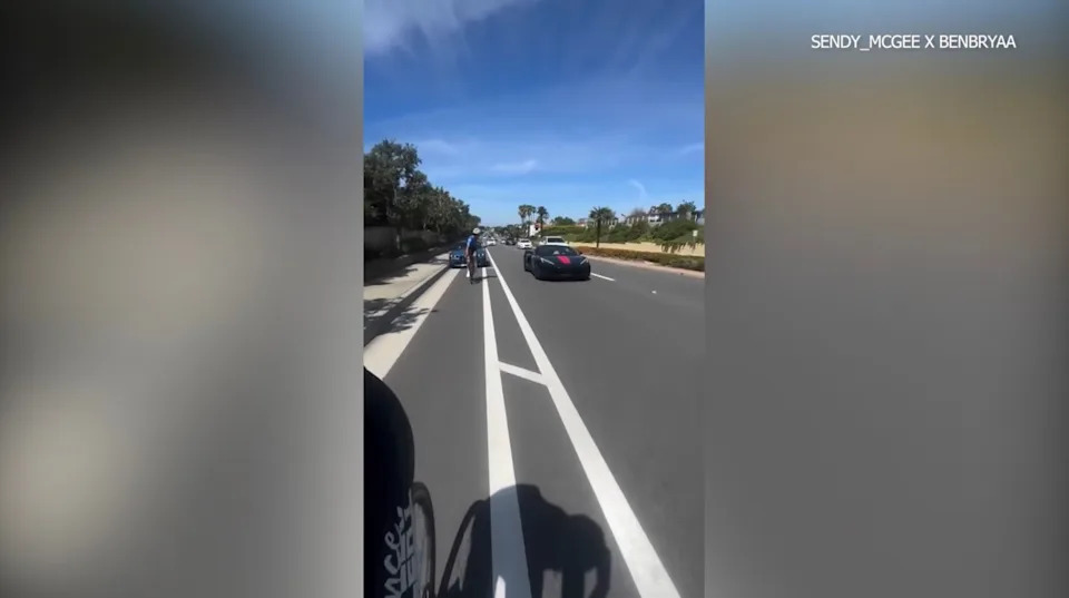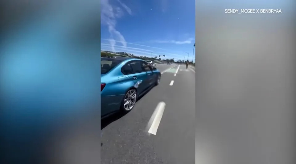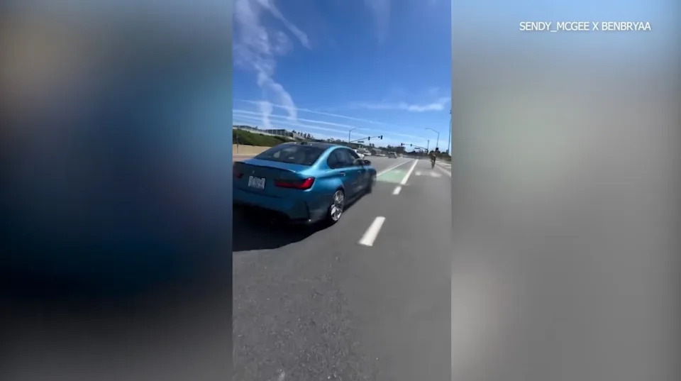 Harrowing video shows a driver in a blue BMW, later identified by police as Weiss, appearing to get dangerously close to two cyclists who were riding in a bike lane along PCH and throwing objects at them.