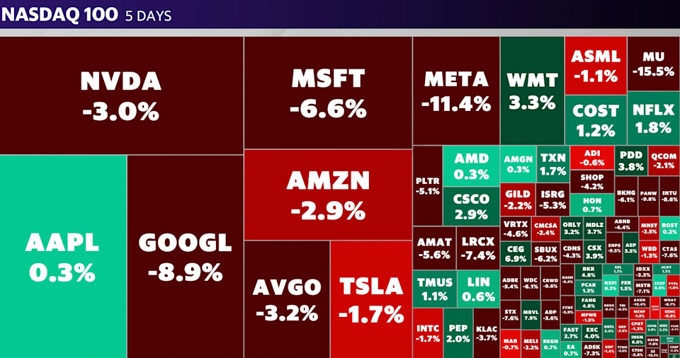 Big Tech stocks were hammered this past week amid growing fears that rising inflation will keep interest rates higher for longer, while company-specific headwinds also weighed on the sector. Collectively, the "Magnificent Seven" megacap stocks erased more than $850 billion in market value over the past week. Meta (META) posted its worst week since October 2025, down more than 11% as Wall Street continued to grapple with the company’s loss in a landmark social media lawsuit earlier this week. A jury found Meta and YouTube parent Google (GOOG, GOOGL) negligent for failing to protect young users on their platforms. Alphabet closed out the week down nearly 9%. Read more: The latest tech stock news and updates Microsoft (MSFT) ended the week 6.5% lower and is on track for its worst quarter since 2008 as software stocks have been particularly hard-hit. Nvidia (NVDA) and Amazon (AMZN) fell roughly 3% for the week, while Tesla (TSLA) dropped nearly 2% over the five-day span. Semiconductor stocks rebounded on Friday, but Sandisk (SNDK) and Micron Technology (MU) still ended the week in the red after sharp losses on Thursday. The sell-off followed Alphabet Inc.’s release of new research outlining an algorithm designed to reduce AI memory usage, a development that rattled memory and broader semiconductor stocks. Growth stocks were hit this week as bond yields rose amid expectations of higher inflation from surging oil prices, with investors anticipating the Federal Reserve will not be able to cut rates this year, as previously expected. The only Magnificent Seven stock to end the week slightly higher was Apple (AAPL), following a report this week that it plans to open its Siri voice assistant to rival artificial intelligence services beyond its current partnership with OpenAI's (OPAI.PVT) ChatGPT. Daniel Howley contributed reporting. Ines Ferre is a senior business reporter for Yahoo Finance. Follow her on X at @ines_ferre. Click here for in-depth analysis of the latest stock market news and events moving stock prices Read the latest financial and business news from Yahoo Finance