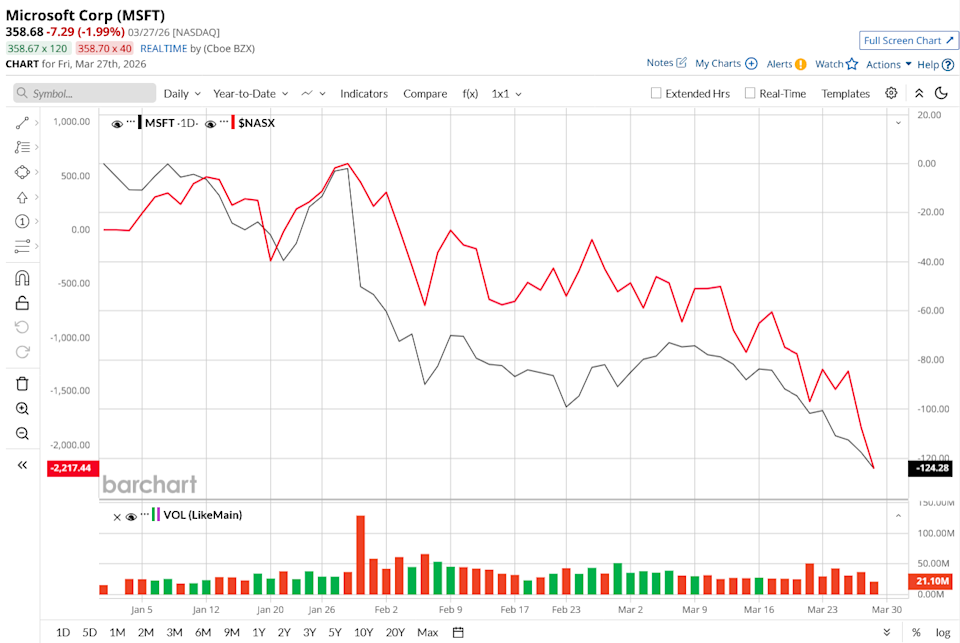 The so-called “Magnificent Seven” stocks once dominated the market, driving most of the gains and becoming the go-to names for investors seeking high growth. But recently, the AI momentum has cooled off. Nonetheless, Microsoft (MSFT) continues to show strong underlying growth, suggesting that while the broader group may be slowing, this tech giant still has plenty of strength left. Even Jefferies and Piper Sandler analysts have chosen Microsoft as their top AI pick, citing the stock's reasonable valuation when compared to its long-term profitability potential. While MSFT is down 26% year-to-date (YTD), compared to the tech-heavy Nasdaq Composite Index ($NASX) fall of 9%, its fundamentals suggest it could rebound by 89% from current levels. META Stock Just Had Its Worst Day in Nearly a Year. Here's What Happened. The Strait of Hormuz Crisis Provided a Temporary Distraction from a Collapse Brewing in AI Stocks. What Comes Next Could Get Ugly. Why Is SanDisk (SNDK) Stock Down Today and Should You Buy the Dip? Get exclusive insights with the FREE Barchart Brief newsletter. Subscribe now for quick, incisive midday market analysis you won't find anywhere else. While the market remains fixated on the ongoing U.S.-Iran war news, high-growth stocks like Microsoft are quietly laying the groundwork for their next leg higher. In its fiscal Q2 2026, Microsoft’s cloud segment surpassed $50 billion in revenue for the first time, growing 26% year-over-year (YoY). Management emphasized that AI adoption is still in its early stages, with significant expansion expected across the entire technology stack. Financially, the company remains very strong. Revenue increased 17% YoY to $81.3 billion in Q2, while earnings per share increased 24% to $41.14. At the same time, heavy investment in AI infrastructure pushed capital expenditures to $37.5 billion, owing to investments in GPUs, CPUs, and data centers. This weighed slightly on margins, with gross margin dipping to 68%. Demand continues to outpace supply, particularly in Azure. Remaining performance obligations, or RPO, reached $625 billion, providing strong visibility into future revenue. What stands out is while Microsoft spent decades building its legacy products, the AI business alone has reached an unimaginable scale in a relatively short period of time. At the core of Microsoft’s growth story is its massive investment in infrastructure. Microsoft is optimizing efficiency through what it calls “tokens per watt per dollar,” which focuses on lowering costs while scaling performance. The company is also diversifying its hardware stack by combining chips from Nvidia (NVDA) and AMD (AMD) with its own custom silicon, like the Maya and Cobalt series, improving both performance and cost efficiency. Beyond infrastructure, Microsoft is investing in what it sees as the next generation of software, AI agents. Its Foundry platform is already gaining traction, with a quick increase in high-spending customers. Meanwhile, its Fabric data platform has grown to a $2 billion run rate with significant momentum. Furthermore, Copilot has become a real monetization engine by quickly becoming a core productivity tool for both consumers and enterprises. In software development, GitHub Copilot has grown rapidly, while in cybersecurity, AI tools are significantly reducing manual workloads. Looking ahead, management expects Azure to grow 37% to 38%, even if overall cloud margins may compress slightly due to ongoing AI investments. But total revenue is expected to rise by 15.8% to a range of $80.65 to $81.75 billion next quarter. Despite the heavy investments, Microsoft generated $5.9 billion in free cash flow and returned $12.7 billion to shareholders via dividends and share repurchases. For the full fiscal year 2026, analysts expect Microsoft’s revenue to increase by 16.4% to $327.8 billion, followed by a 22% increase in earnings to $16.73 per share. Many analysts believe Microsoft is a cheap AI stock and that its long-term earnings potential has not been recognized yet. This is probably why the stock is trading at 19 times forward 2027 earnings, which are expected to increase by 12.6%. The market’s recent hesitation around mega-cap tech stocks is largely tied to concerns over valuation and rising AI spending. Yet Microsoft still appears attractively valued relative to its long-term AI-driven growth potential. Despite being an established tech titan with a wide array of legacy products, the company has remained resilient in different economic cycles. And it is still growing, with cloud demand accelerating and adoption deepening, supported by a full-stack AI ecosystem spanning infrastructure, platforms, and applications. While capital spending is massive, these investments reflect the cost of building a dominant position in what could be the most important technology shift in decades. This explains why analysts' stance on Microsoft's stock hasn’t changed over the last three months, despite the market’s reaction. Overall, MSFT stock has a consensus “Strong Buy” rating. Of the 50 analysts covering the stock, 41 rate it a “Strong Buy,” four rate it a “Moderate Buy,” and five rate it a “Hold.” MSFT stock is trading 35% below its 52-week high of $555.45. This pullback could be an opportunity for investors to buy this tech titan on the dip, as the average target price suggests the stock could surge 64% from current levels. Plus, its high price estimate of $678 implies the stock could rally 89% over the next 12 months. On the date of publication, Sushree Mohanty did not have (either directly or indirectly) positions in any of the securities mentioned in this article. All information and data in this article is solely for informational purposes. This article was originally published on Barchart.com
