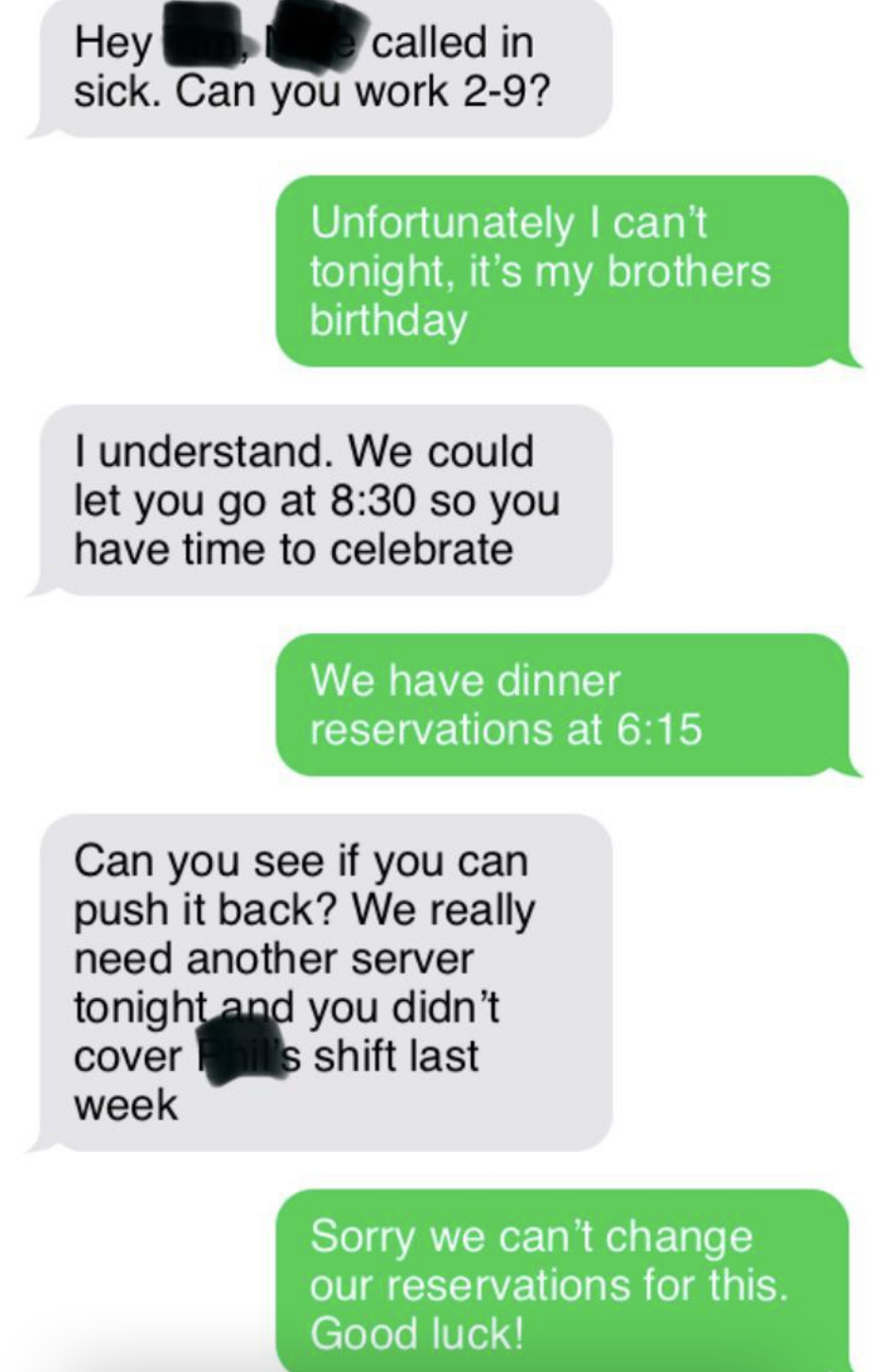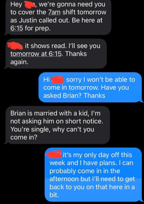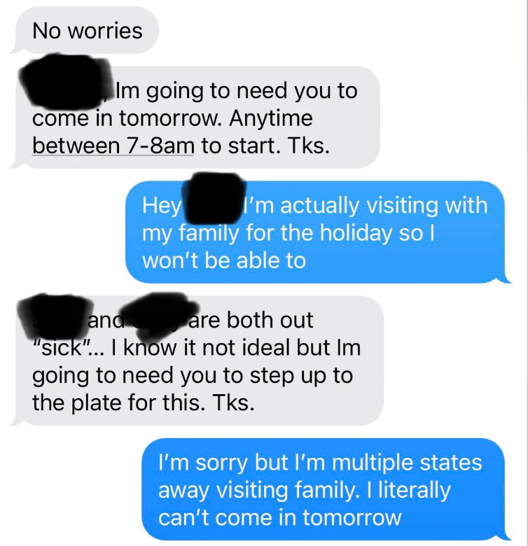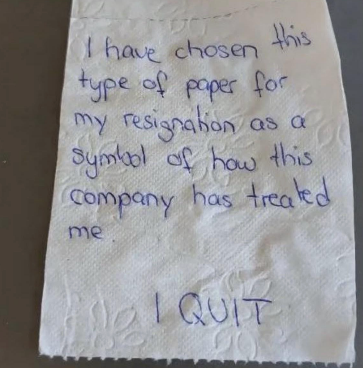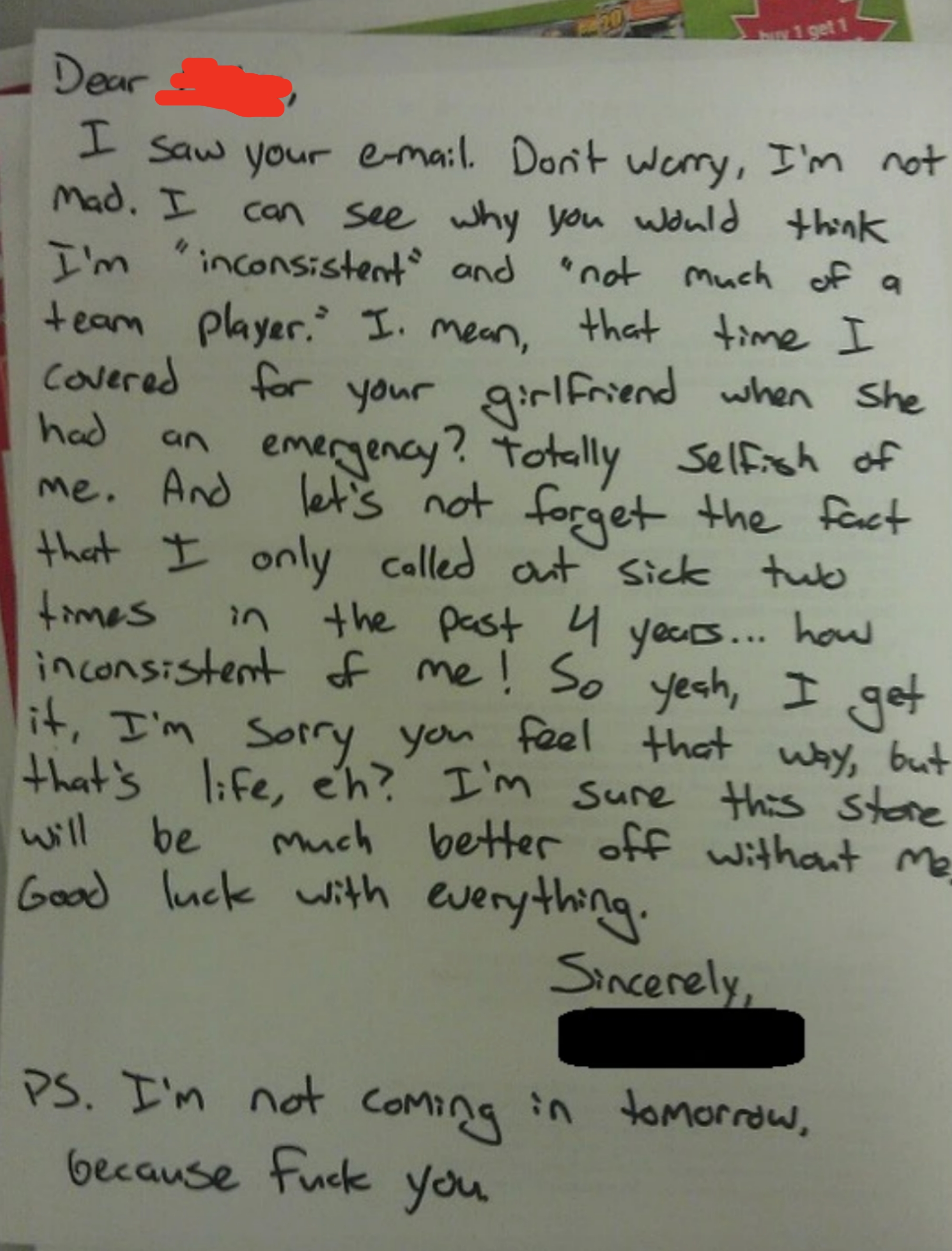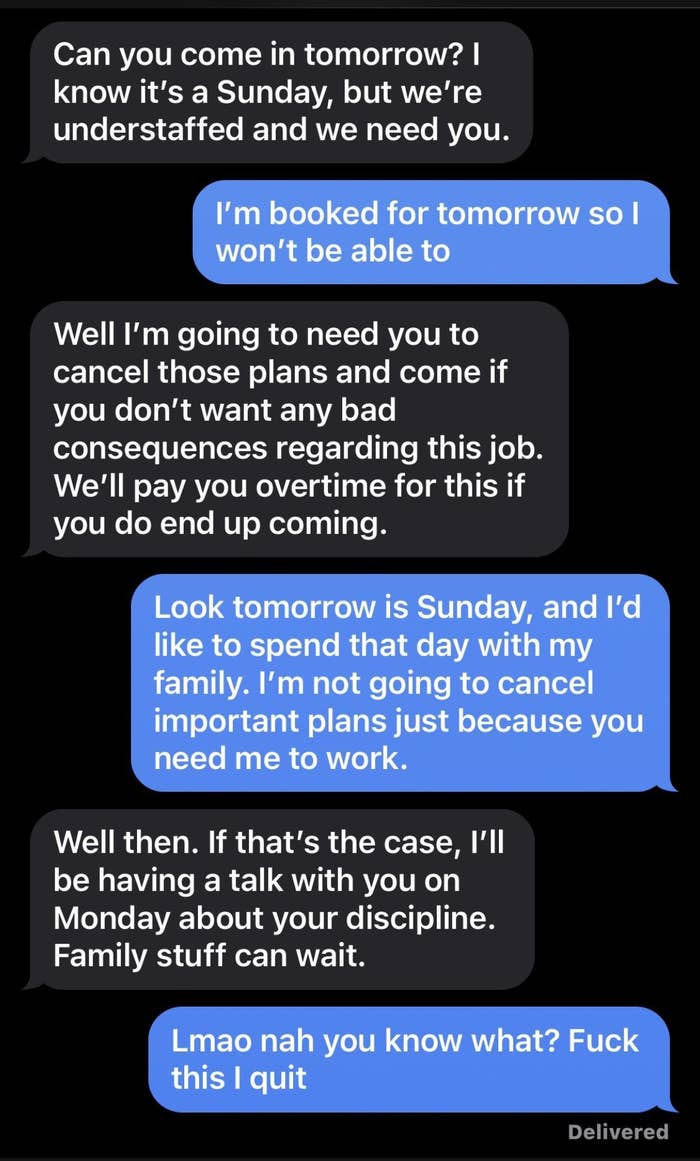 I've never seen someone write their resignation letter on a cake before. I'm a Senior Staff Writer who writes a wide range of topics, spanning from people's real-life drama to pop culture to funny things I find on the internet. Employee: "I would like to know if I am still employed with [redacted] please. Instead of wasting both of our time with coming up there tomorrow. Thank you [redacted]" Boss: "It's amazing that now you respond to your text! 🙌" Employee: "It's amazing how patronizing managers at this establishment are. I'll save us both the trouble. I resign as shift lead at [redacted] effective immediately. I'll be in for my check Monday. Thank you." Employee: "Hey [redacted] I'm just wondering how the clock in system works. I've notice on my paycheck it is always rounded to 15 minutes. I clocked in at 4:01 today and I'm just wondering if that gets rounded to 4:15 or 4:00? Thanks!" Employee: "Okay that makes sense. I've been clocking out when I'm done instead of intervals so I just wondering about that." Employee: "So If I clock out at 10:40 does that get rounded up to 10:45 or 10:30?" Employee: "Also is it possible to get a record of my time sheet?" Boss: "I never done that before. I will ask [redacted]" Boss: "Np. But nothing shady is happening. It works that way everywhere" Employee: "I'm sorry I didn't mean to imply anything shady was happening. I was just wondering if I need to wait for a 15-minute interval to clock out. And I just want to know for next time, that if I clocked in at 4:01 and clocked out at 10:44. Would that mean I lose out on 28 minutes of pay?" Boss: Yes or it will round down when you punch out" "$14.00 is not enough to essentially manage a store. I (we) are not managers. We do not need to be available 24/7. We are not paid enough to afford rent. — staff" Boss: "[redacted], I’m going to need you to come in tomorrow. Anytime between 7–8am to start. Tks." Employee: "Hey [redacted] I’m actually visiting with my family for the holiday so I won’t be able to" Boss: "[redacted] and [redacted] are both out “sick”… I know it not ideal but Im going to need you to step up to the plate for this. Tks." Employee: "I’m sorry but I’m multiple states away visiting family. I literally can’t come in tomorrow." Boss: "Unbelievable. Just the other week you were complaining bout money and you dont have enough to eat and now when I offer you extra hours which means extra $$$ you dont jump on the opportunity?" Boss: "You better not be moping around BOH complaining anymore. Im giving you an opportunity to make more and you pass it up and do nothing bout it..." Employee: "That’s extremely disrespectful and uncalled for. I’m not responding to anymore messages, that’s so inappropriate" Boss "Hey [redacted], we’re gonna need you to cover the 7am shift tomorrow as Justin called out. Be here at 6:15 for prep." Boss: "[redacted] it shows read. I’ll see you tomorrow at 6:15. Thanks again." Employee: "Hi [redacted] sorry I won’t be able to come in tomorrow. Have you asked Brian? Thanks" Boss: "Brian is married with a kid, I’m not asking him on short notice. You’re single, why can’t you come in?" Employee: "[redacted] it’s my only day off this week and I have plans. I can probably come in in the afternoon but I’ll need to get back to you on that here in a bit." Boss: "We need someone to cover the early morning shift. The afternoon isn’t going to work. What do you have planned that you can’t come in?" Employee: "Helping a friend move in the morning, but that isn’t important [redacted]. I have plans on my day off so I cannot come in. I apologize but I will not be able to work tomorrow morning." Employee: "You trying to mandate this at almost 10pm the night before is ridiculous [redacted]. You know I’m a hard worker and I’m loyal, but I would ask for some respect as well." Boss: "Can’t your friend find someone else or wait until you get off? I would caution you to choose your next words very carefully, [redacted]. I know you’re strapped for money this month." Employee: "I’m sorry but I cannot work for you anymore. This is ridiculous that you are saying these things. We’ve known each other for almost four years and you know I’m a good worker. Consider this my two weeks notice. I’ll see you Monday unless you have me terminated before then." I saw your e-mail. Don’t worry, I’m not mad. I can see why you would think I’m 'inconsistent' and 'not much of a team player.' I mean, that time I covered for your girlfriend when she had an emergency? Totally selfish of me. And let’s not forget the fact that I only called out sick two times in the past 4 years… how inconsistent of me! So yeah, I get it, I’m sorry you feel that way, but that’s life, eh? I’m sure this store will be much better off without me. Good luck with everything. P.S. I'm not coming in tomorrow because f**k you." Writing says: "I have chosen this type of paper for my resignation as a symbol of how this company has treated me. I quit: "If you read my message instead of just looking at dollar signs, you’d see I messaged you about a Sous/Exec Sous role. The job that was attached was not the correct one. That’s my mistake, but you are not qualified for a six figure Exec Chef position. Recruiter: "If you read my message instead of just looking at dollar signs, you’d see I messaged" Person: "Is this a joke or something? Does this guy actually work for you and is this how you" Recruiter's boss: "I apologize, I do see the word 'Unsubscribe' at which point, all communication should have ceased." "[Name/company redacted]’s net worth is over 400 billion dollars.Our sales plan for just today is over 100k dollars. A 24 pack of water is $4.98, without pro discounts. If [name/company redacted] is not comfortable with sparing $4.98 once every few days for its employees to hydrate, then I will be buying water with my own money and leaving it in this employee-use fri