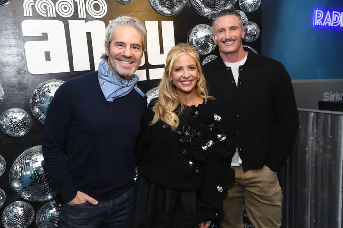 NEW YORK, NEW YORK - MARCH 18: Sarah Michelle Gellar the Radio Andy show with hosts Andy Cohen (L) and John Hill at SiriusXM Studios on March 18, 2026 in New York City. (Photo by Gary Gershoff/Getty Images)