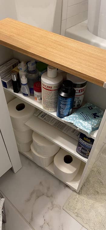 Promising review: "In spite of this rolling cart being on the pricier side, I really appreciate its functionality and aesthetics. My apartment bathroom is on the smaller side and has no built-in storage, aside from an over-the-sink medicine cabinet. I knew I needed a space-saving solution that would keep eyesores out of sight (e.g., cleaning supplies, extra toilet paper), so I finally bit the bullet and purchased this cart. I have no regrets! I love that it fits right next to the toilet and doubles as a side table for things like tissue paper, room sprays, and cellphones. The top of the cart is a solid plank of wood, which is a nice touch, and the handle makes it easy to pull the cart out. The cart's dimensions are perfect for fitting several rolls of extra toilet paper, a toilet scrubber, cleaning products, and any other items you'd like to keep out of sight. Assembly was easy as well. All you need to do is attach the handle and wheels. Overall, I'm really enjoying using this cart in my small living space!" —Solae Studio