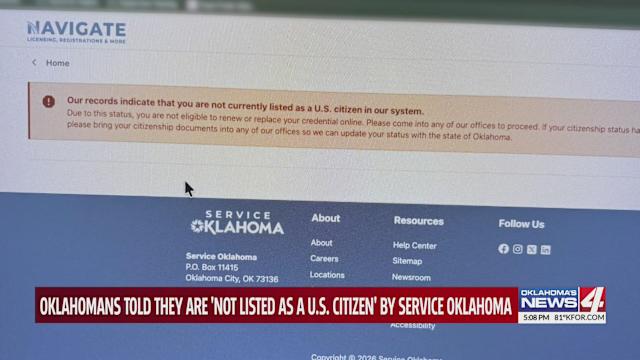 OKLAHOMA CITY (KFOR) — Some Oklahomans are having trouble renewing their driver’s license online. Last month, Service Oklahoma updated its system to make driver’s licenses and vehicle services fast. Service Oklahoma to launch faster, unified system for driver license and vehicle services However, some say they’re receiving a message that says they are not U.S. citizens. “Our records indicate that you are not currently listed as a U.S. citizen in our system,” said Ceciley Thomason, a woman trying to obtain a state driver’s license. This is the message some Oklahomans are getting while trying to obtain a license online. I’m going to be honest, it was alarming because around that time there were some very scary things going on with immigration,” said Thomason. Ceciley Thomason was trying to get a state driver’s license online after she moved. “My husband, he does have a real ID already, and he was able to go in through, no problem,” said Thomason. “Then, when I went to go change or update my ID, I got the screenshot that you saw on Facebook, where it says, we don’t have you as a citizen. I was like, that’s strange.” Thomason is a citizen of the Cherokee Nation. She says she already has a tribal driver’s license and passport card. Thomason says while filling out the information online, she input her driver’s license number and social security number, but still received the message. She tried multiple browsers but was still told she is ‘not listed as a U.S. citizen.’ “I cannot imagine being someone who is going through this and also actively worried about an immigration issue,” said Thomason. News 4 reached out to Service Oklahoma about this issue. We’re aware that some customers may see this message when attempting to complete a renewal online. While the wording is not as clear as it should be, it is simply indicating that additional information is needed before the transaction can be completed. Not all customers are eligible to renew online for a variety of reasons, including when certain documentation needs to be verified. In these cases, customers can quickly complete their renewal in person at a Service. Oklahoma location or with a licensed operator. We are updating our messaging to ensure it is more clear and helpful for customers moving forward. Service Oklahoma Thomason recently went to the tag agency to handle the issue in person, but at last check, the status of her license is not pending, and she still receives the same message. Copyright 2026 Nexstar Media, Inc. All rights reserved. This material may not be published, broadcast, rewritten, or redistributed. For the latest news, weather, sports, and streaming video, head to KFOR.com Oklahoma City.