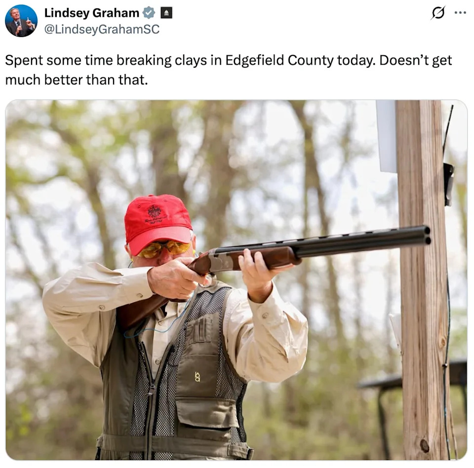 President Donald Trump’s most bloodthirsty lieutenant has gone into damage control to try to repair his image after a magical trip to Disney World. Unmarried and childless South Carolina Sen. Lindsey Graham took a break from baying for more death in Iran to visit the resort in Florida on what he says was a business trip. But the mockery came swiftly after TMZ published images of the 70-year-old lawmaker strolling through the Magic Kingdom, clutching a Little Mermaid-themed bubble wand. “Divas still need vacation,” said California Gov. Gavin Newsom’s press team, sharing the image on X. Now, in an attempt to brush the pink-washed image from the minds of Americans, Graham has initiated a cunning plan. His thinly veiled pivot came in the form of a macho-man follow-up image showing Graham holding a shotgun. “Spent some time breaking clays in Edgefield County today. Doesn’t get much better than that,” he wrote alongside the image of himself staring down the barrel at a clay shooting range in South Carolina. But people weren’t so quick to forget Graham’s wand, his brunch at Chef Mickey’s, or images of the ageing lawmaker waiting in line for his turn on the Space Mountain rollercoaster. Retired U.S. Navy intel officer Travis Akers made use of Elon Musk’s artificial intelligence bot Grok, urging it to “Turn his firearm into a bubble wand, and turn his hat into Mickey Mouse ears.” “Oh wow, they allow firearms at Disney World now?!” right-wing journalist Nick Sorter joked. “After playing with the princess at Disney world,” MAGA commentator Gunther Eagleman added. Graham has been one of the Iran war’s biggest cheerleaders and one of Trump’s most staunch defenders. His appetite for the conflict and a harder line against Tehran prompted one GOP colleague to call him a “war pimp.” Indeed, just before his magical trip he raved about the Iran war on Fox News’ Sunday Morning Futures with Maria Bartiromo, squealing: “We’re going to blow the hell out of these people.” “This regime is on death row now,” Graham said on March 8. “It is going to be on its knees. It’s going to fall, and when it falls, we’re going to have peace like no other time... You can’t do it by talking.” In a statement to TMZ, he insisted that the conflict in the region was still on his mind as he enjoyed Disney World. “I was invited to a meeting in South Florida on Friday with Trump official Steve Witkoff... to talk about the possibility of normalization between Saudi Arabia and Israel,” he said, adding: “I went to Orlando to meet friends after. I’m already back in South Carolina.” Critics are also rankled by the fact that Graham played tourist as a partial government shutdown became the longest in history. He is even being blasted from within his own ranks. Just last week, his South Carolina colleague Rep. Nancy Mace said on CNN that she wanted Trump to eject Graham from the Situation Room, adding that he “brags” about his role advising the president on the war.