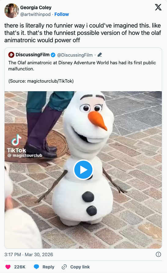 Over 31 Million People Are Losing It At This Video Of Robot Olaf "Dying" At Disneyland
