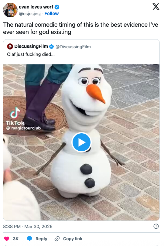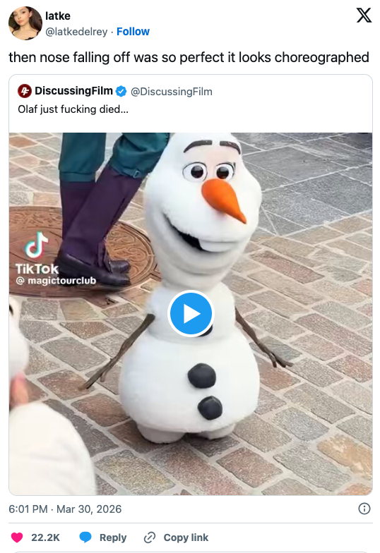Looks like Olaf went "into the unknown." Angelica Martinez is the Latine Editorial Lead at BuzzFeed and covers a little bit of everything, from quizzes and true crime to celebrities and pop culture. *Kidding, kidding! Per park goer @coasterclairee, Olaf is back up and running today.