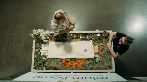 After decades working in mortuaries, a campaigner hopes to provide the UK's first human composting service as an alternative to cremation or burial. Human composting, also known as terramation, is when the body of a person who has died is placed in a sealed vessel containing organic matter. Over the course of several weeks, the body turns completely to soil. Terramation is not legal in the UK, but a consultation on the subject for the UK government by the Law Commission is due to be published imminently. Druid Kristoffer Hughes, who recently returned from the US where terramation is legal in several states, said he believed the practice could offer a "deeply ecological and spiritually meaningful" alternative to cremation or burial. This story contains details about human composting funeral services which some readers may find upsetting. Hughes, a broadcaster, author and leader of the Anglesey Druid Order, spent three decades working for coroners across the UK and abroad as a specialised mortuary technician. Those experiences led him to examine approaches to death across the world for the S4C documentary series Marw gyda Kris (Dying with Kris). "I genuinely didn't think there was anything left to surprise me in the death service world," said Hughes. "Until we went to a human composting facility." Hughes visited Return Home, south of Seattle in Washington state, the world's first large-scale human composting facility. There, instead of burial or cremation, bodies are placed in a sealed vessel containing organic matter such as alfalfa, straw and wood chips. After 60 days, all that remains is a rich, fertile soil. The soil is returned to the families of those who have died, to use to grow whatever they want in memory of those they have lost. Hughes himself lay in one of the caskets to experience it. "It felt like being immersed in summer," he said. "I was surrounded by natural organic materials. It smelt good. "And I realised at that moment that my body was not going to be disposed of, but rather transformed. "Of all the ways I've seen death handled around the world, this felt the most natural, the most honest - and the most hopeful." Back home on Anglesey, what Hughes first witnessed in Washington state has now become a passion. He said he was inspired by the work of Dr William Price, a self-proclaimed druid who was put on trial in Cardiff for trying to cremate his deceased five-month old son in 1884. Price was acquitted, leading directly to a new law allowing cremation in the UK. "[Price] was always an inspiration to me as a death service professional, but also as a druid," said Hughes. "So when I came across terramation, I was like 'wow - do you know what, it could be a druid in the 21st Century that actually brings another facet of end-of-life and death care into being'." Hughes and his colleague Chris Cooper-Hayes, who has a professional background in landscaping, have founded Eterrna, a venture they hope could become the very first to offer human composting in the UK. They have recently returned from the US, where they returned to Return Home to become the some of the very first people in Britain to be trained in terramation. But being trained in the process is perhaps the easiest hurdle to overcome. A year long consultation by the Law Commission for the UK government which has reviewed new funerary methods, including human composting, is due to be published soon. It could provide a framework for changes in current laws to allow terramation. A process known as water cremation was recently legalised in Scotland as a new funeral process. The Ministry of Justice said it is awaiting the findings of the latest review. "We are aware of the growing interest in alternative funerary methods and we will respond to the Law Commission's report in due course," said an official. However, the issue would remain devolved to Wales. The Welsh government said it was following the Law Commission report and would "consider the devolved implications once it is published". Hughes believes the case for human composting is so overwhelming that he is actively searching for individuals who want to take that step when they die. "Cremation produces significant carbon emissions and traditional burial takes up land and resources," said Hughes. "Human composting gives us another option - one that's deeply ecological and spiritually meaningful. "At the end of the process, you become soil that can grow forests, feed gardens, and nurture new life. It's the most beautiful continuation I can imagine." Hughes said he was also confident that a terramation service would be comparable with the cost of traditional funerals, once it becomes established. He said the cost of the service in the US was considerably cheaper than a traditional funeral. According to research published by SunLife in its annual study into funeral costs, the average price of a simple funeral in the UK last year was ยฃ3,800, with an additional ยฃ1,300 spent on flowers and catering. More than half of the services are for cremations, while burials are about ยฃ1,000 more expensive. But while Hughes and supporters believe human composting is a win-win for both the environment and bank balances, it has faced opposition. In the United States, the Catholic Church has campaigned against human composting wherever legislation has been introduced to implement it. Back in 2022, when New York State was preparing to approve the practice, the state's Catholic Conference urged voters to contact its governor to voice opposition. "The New York State Bishops oppose this bill because composting is a process typically used for household or agricultural waste, and does not provide the respect due to bodily remains," the Catholic Conference told the Catholic Courier newspaper at the time. The Vatican itself has not spoken on the matter, but in 2016 did set out its position to recommend that the bodies of the deceased are buried in cemeteries or other sacred places. 