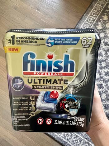 Promising review: "I absolutely love the Finish dishwasher tablets! They work incredibly well. My dishes come out sparkling clean every time, with no residue left behind. The fresh scent is subtle and pleasant, not overpowering or chemical-like.These tablets dissolve perfectly and leave no trace, just spotless dishes and glasses. I’ve tried other brands before, but none have matched the effectiveness and quality of Finish. Highly recommend for anyone looking for reliable and hassle-free dishwasher results!" —Meiggan