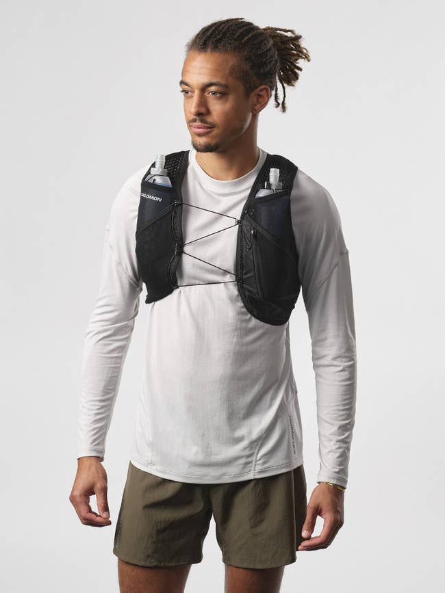 Promising review: "Getting into longer distance running, and this is perfect for carrying food and water needed during longer efforts. The provided water bottles are good for a two- to three-hour effort, and it's nice to have the option to add a water bladder for longer runs. The mesh is comfortable and breathable. There's a back pouch that is big enough for a light jacket. Front clasp is adjustable, which is nice." —Max T