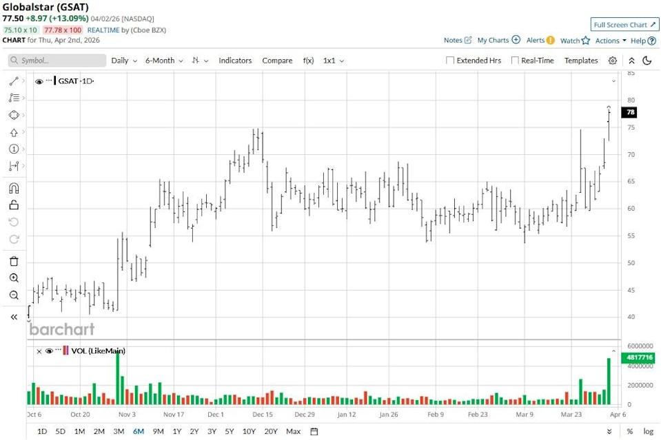 Globalstar (GSAT) shares closed nearly 15% higher on April 2 following reports that Amazon (AMZN) is in advanced talks to acquire the satellite communications firm for about $9 billion. This potential acquisition is reportedly a strategic play to strengthen Amazon Leo as it races to compete with billionaire Elon Musk’s satellite-internet network, Starlink. Dear Tesla Stock Fans, Mark Your Calendars for April 21 Stocks Pare Losses on Hormuz Report Stocks Recover on Hopes Strait of Hormuz Could Soon Reopen Stop Missing Market Moves: Get the FREE Barchart Brief – your midday dose of stock movers, trending sectors, and actionable trade ideas, delivered right to your inbox. Sign Up Now! Versus its year-to-date low, Globalstar stock is now up roughly 45%. While the prospect of an AMZN buyout is exciting, the window for meaningful gains may have already slammed shut. According to the Financial Times, the e-commerce behemoth is willing to pay $9 billion for GSAT — but its market cap has already ballooned to nearly $10 billion following today’s stock price rally. This means the market hasn’t just “priced in” the potential acquisition premium, but has arguably overshot it. Investors buying at these levels are essentially paying a premium above the expected deal price, leaving virtually no upside in GSAT shares following the official announcement. Moreover, if Amazon chooses to take Globalstar private, shareholders will be cashed out at a fixed price, further capping potential for capital gains. On the flip side, the downside risk is even more concerning should the merger fail. Since GSAT’s recent gains are built entirely on acquisition rumors instead of fundamental business growth, if negotiations collapse, it may crash just as quickly to the pre-rumor levels. Meanwhile, there’s hardly any solace to be found in the firm’s current valuation either. Globalstar shares are currently going for eye-watering 2,500x forward earnings, which makes them a gamble at best. Even from a technical perspective, GSAT’s relative strength index (14-day) surpassed 67 today, indicating upward momentum is now approaching exhaustion. It's also worth mentioning that Wall Street analysts saw Globalstar as fairly valued at its pre-rumor price. According to Barchart, the consensus rating on GSAT stock sits at “Moderate Buy” currently, but the mean target of $69.75 is only slightly above the price at which it was trading before the Amazon news. On the date of publication, Wajeeh Khan did not have (either directly or indirectly) positions in any of the securities mentioned in this article. All information and data in this article is solely for informational purposes. This article was originally published on Barchart.com