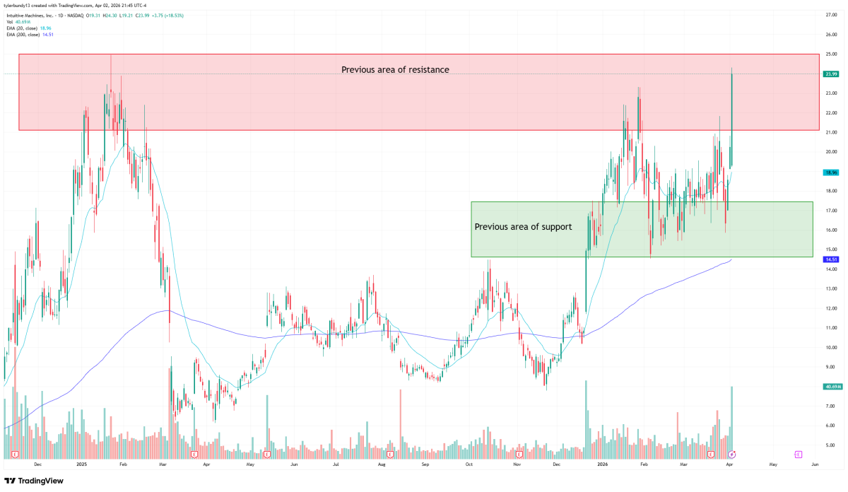 Intuitive Machines (LUNR) moved sharply higher as investors circled back to one of the few public companies with a real commercial moon-delivery business. The stock’s move appears tied to a broader burst of lunar enthusiasm after the successful Artemis II launch, which pushed space names higher across the board. Coverage of the rally said Intuitive Machines was one of the stocks benefiting from renewed attention on companies tied to NASA’s moon program. On March 24, Intuitive Machines said NASA awarded it a $180.4 million CLPS task order for the IM-5 mission. The company said the mission will use its larger Nova-D lander to deliver seven science and technology payloads to the lunar south pole region, making it the company’s fifth CLPS task order and its first mission requiring the larger cargo-class lander. Intuitive Machines is trying to build a repeatable lunar-delivery and infrastructure business, and IM-5 adds to the case that NASA is still relying on it as one of its commercial moon partners. The company also said the mission will use its lunar landing system, space data network, and autonomous surface operations capabilities, which gives investors a broader platform story than just a single lander contract. The recent earnings release added another layer to the move. On March 19, Intuitive Machines said 2025 was a “transformational year,” citing its second lunar mission, expansion into national security space programs, and the acquisitions of KinetX Aerospace and Lanteris Space Systems. Intuitive Machines is no longer trying to look like a single-mission moon stock. It is trying to look like a broader space infrastructure company with exposure to lunar access, data services, orbital work, and national security programs. The company’s investor materials describe the business across Lunar Access Services, Orbital Services, Lunar Data Services, and Space Products and Infrastructure, which helps explain why a broader lunar theme can move the shares so quickly. The rally has a cleaner setup than a random space-stock spike. Artemis II gave the market a reason to care about lunar names again, and Intuitive Machines came into that moment with a fresh NASA award already in hand. That combination is what gives the move more credibility. 47-year-old luxury home retailer’s stock tanks after Q4 miss Surging Chevron stock has more going for it than just higher oil prices Palantir stock tests key level as Pentagon momentum builds The bigger investor question is whether this becomes a rerating or just another momentum burst in a volatile name. For now, the fundamental argument is straightforward: LUNR moved because lunar enthusiasm returned, and Intuitive Machines already had real contract news in place when that wave hit. LUNR’s technical setup improved sharply on Thursday as the stock broke higher on heavy volume and pushed back into a familiar resistance zone. Yahoo Finance showed the stock opened at $19.32, traded as high as $24.30, fell as low as $19.21, and closed at $23.99, up 18.53% on the day. Volume reached 40.69 million shares, far above its average daily volume of about 11.63 million. The trend picture also looks constructive. The 20-day EMA sits at $18.96, while the 200-day EMA sits at $14.51, leaving the stock well above both levels. That keeps the short-term and longer-term trend pointed in the same direction and shows the move is coming from a stronger chart base than a typical one-day momentum spike. The most important area overhead sits roughly between $21 and $25. That zone has acted as resistance before, and Thursday’s rally pushed the stock directly back into it. Under ordinary conditions, that kind of move would raise the odds of sellers showing up again. The difference this time is that the stock has a fresh fundamental catalyst behind it. The recent NASA award and renewed Artemis-related enthusiasm give buyers a stronger reason to test whether LUNR can push through the zone rather than stall out in it. The cleaner support area underneath the price sits around $14.50 to $17.50. That band had previously acted as support and resistance, and it now looks like the first broader area buyers may try to defend if momentum cools. The low end of that range also lines up closely with the 200-day EMA, which gives it more technical importance. The 20-day EMA near $18.96 is the first nearer-term level to watch on any pullback. If LUNR starts to fade after the surge, traders will likely look there first before shifting attention to the broader support band. Related: Nvidia’s headquarters: An ode to space and 3D rendering This story was originally published by TheStreet on Apr 3, 2026, where it first appeared in the Investing section. Add TheStreet as a Preferred Source by clicking here.