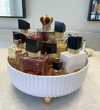 "This swiveling tray is the perfect size for holding the items that I keep on my bathroom counter. Love the rose gold feet. Comes assembled so no worries about having to put anything together. It appears to be very sturdy and it makes it easier to clean the counter top when you can move just one item as opposed to moving several different items. Would definitely recommend." —Rona