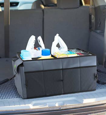 Promising review: "I love this trunk organizer for my SUV. I can secure it with the tie-down straps provided and they work very well. I can collapse one side of it to make it smaller if needed. Although I keep mine set up all the time, you unlatch it, fold it completely down and store it easily if necessary. This organizer is perfect for those big shopping days with family and friends. We each have our own area to put our packages so we know what to grab when we get home. It's also perfect for groceries so I can keep the cold things together, and the bottles and drinks from tipping over or sliding around in the back. This organizer is spacious, made of quality materials, and is well-made (sewn and constructed well). It's really the perfect organizer that will provide you years of use!" —Placeholder