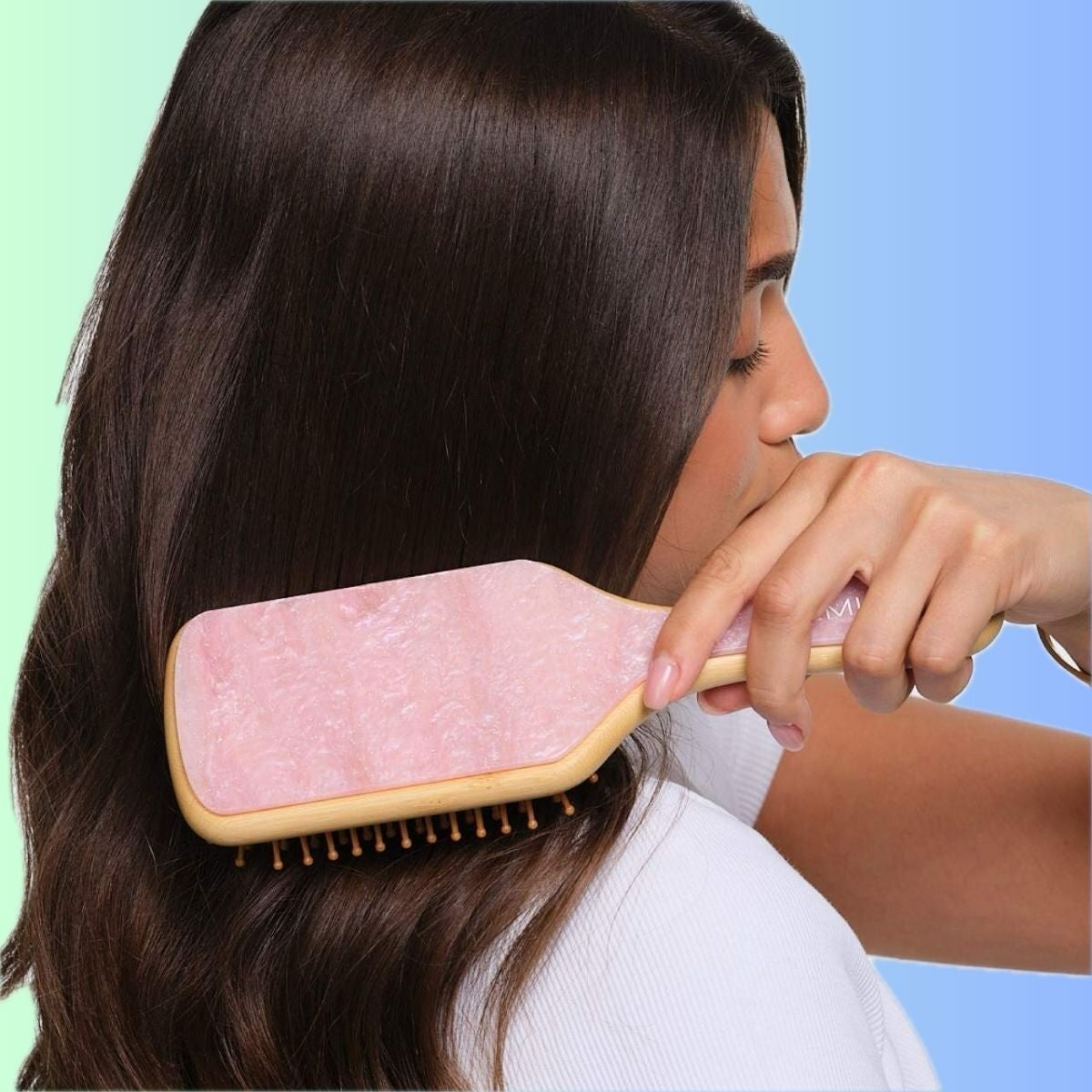 This stunning paddle brush with pearlescent shades of pink and white will look great left out on your vanity. The Emi Jay bamboo paddle hairbrush is made for all hair types and is plastic-free.