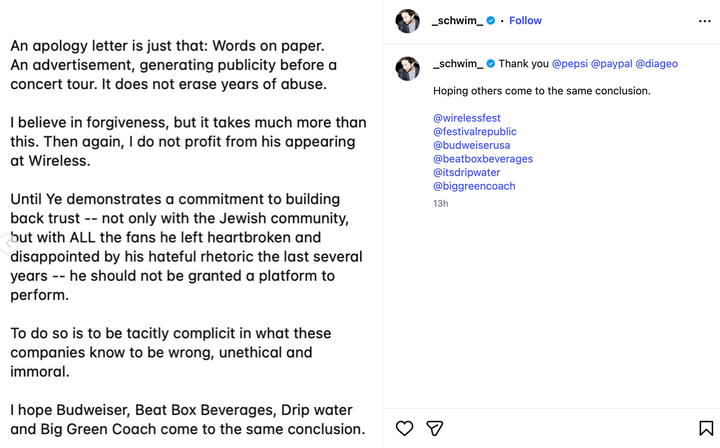 “Until Ye demonstrates a commitment to building back trust — not only with the Jewish community, but with ALL the fans he left heartbroken and disappointed by his hateful rhetoric the last several years — he should not be granted a platform to perform,” Schwimmer wrote in a lengthy essay on Instagram.