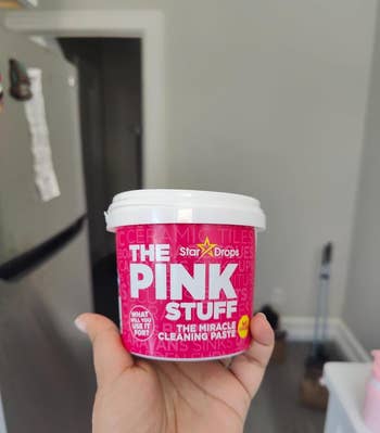 Promising review: "The Pink Stuff is definitely worth all the hype it has been receiving. I had seen it in some TikTok compilations and decided to give it a try. The very first thing I cleaned was the inside of my bathtub, and wow! It really made my bathtub shine. Before I was using Kaboom, and that didn't clean as well as The Pink Stuff did. I was seriously shocked. The next thing I decided to use it on was some caked-on grease on my hood vent. Just like the bathtub, I was shocked that it was able to get it all off. All you do is apply the paste with a sponge or cloth to whatever you're cleaning, and then rinse it with warm water. I found that with stubborn spots, add a little warm water to the paste (if you have a spray bottle, I'd recommend filling that with warm water and misting the paste), scrub the spot a little longer, and then rinse. It worked with no issue. I'm definitely interested in looking at their other cleaning products. I would highly recommend giving The Pink Stuff a try yourself!" —JMURR