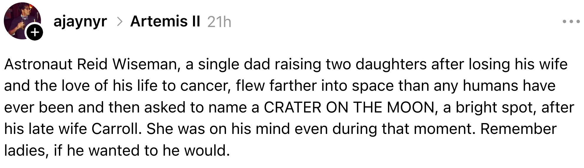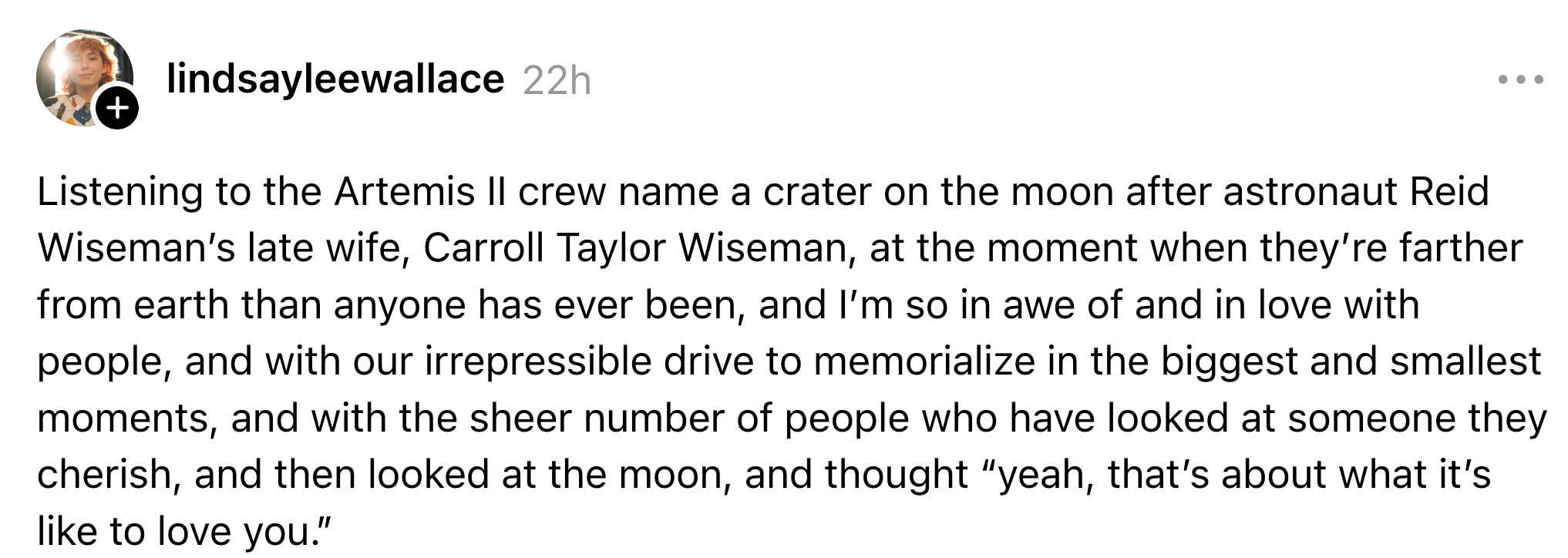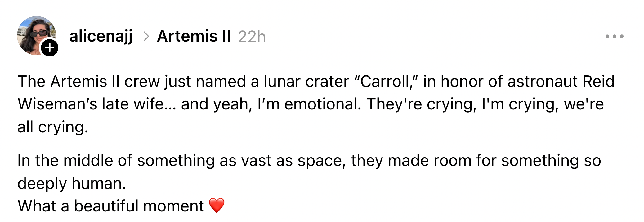 In an emotional moment broadcast live from the Orion spacecraft, the Artemis II crew chose to name a Moon crater “Carroll" after commander Reid Wiseman's wife, who died of cancer in 2020.“It's a bright spot on the Moon. And we would like to call it Carroll." pic.twitter.com/3p220FdaV7