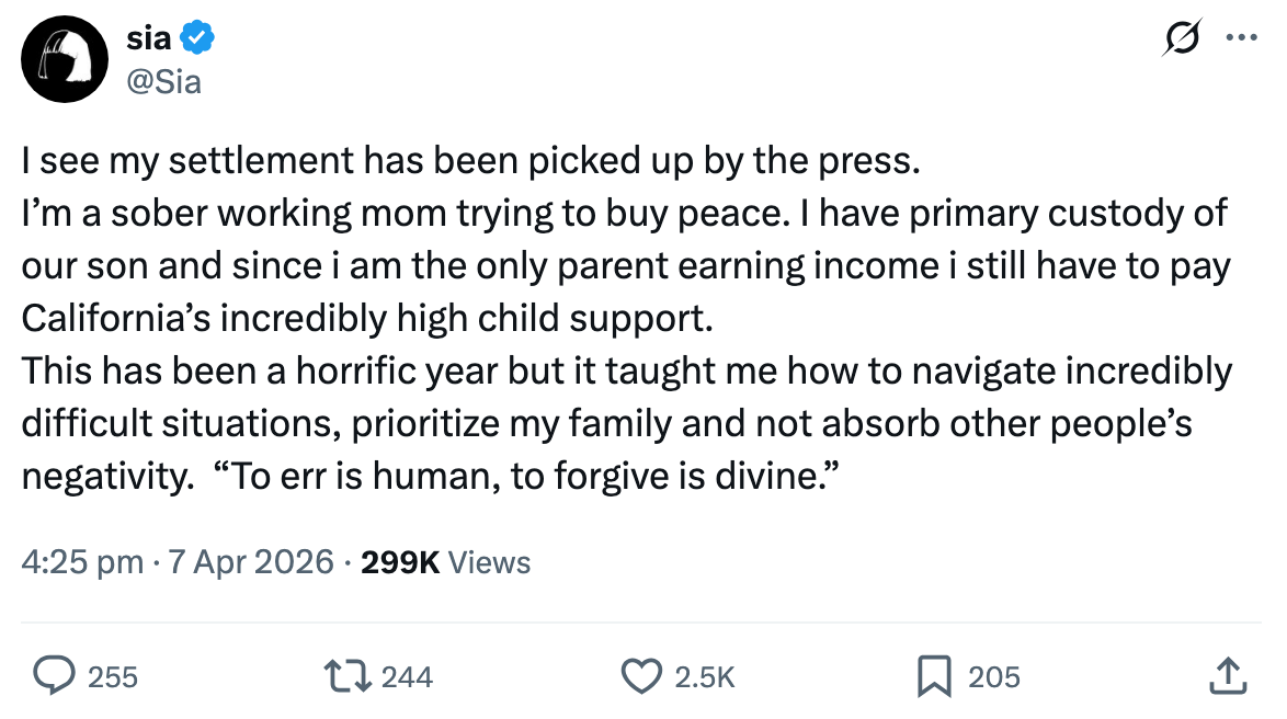Sia Reacted To Having To Pay $42.5K Monthly In Child Support, Despite Having "Primary Custody"