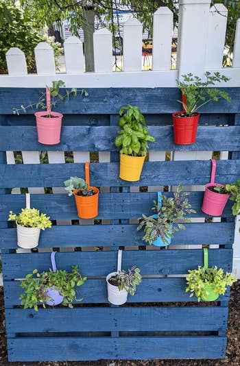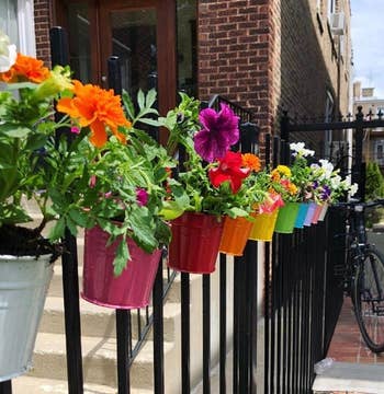 Promising review: "Lovely colorful flower pots. Perfect size to hold a single flower, and they add such a nice pop of color to my yard. Very easy to hang up, no hardware required! I’m getting a lot of compliments on them. I bought several sets and planted bright flowers in them. I have them lining the inside of my yard and on the front of the house. They add a lot a cheer and homeyness for a simple and cheap project." —Maegan
