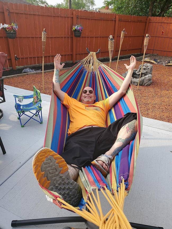 Promising review: "This is an amazing hammock! The bright colors, the sturdiness and the very easy setup. It took myself and my sister in law about five minutes to setup. I put this hammock in my backyard, had some visitors for a couple of weeks and they used it very very regularly, to read, sleep, and just lounge. The only thing that may bother some people is that when lying in it the sides come over and wrap you like a cocoon. But I love it!!" —Juliet, Florida