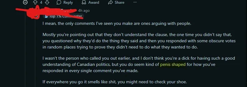 "I mean, the only comments I've seen you make are ones arguing with people... [Y]ou do seem kind of penis-shaped for how you've responded in every single comment you've made. If everywhere you go it smells like shit, you might need to check your shoe."