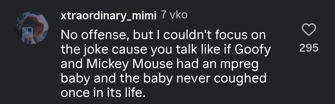 "No offense, but I couldn't focus on the joke because you talk as if Goofy and Mickey Mouse had an mpreg baby and the baby never coughed once in its life."