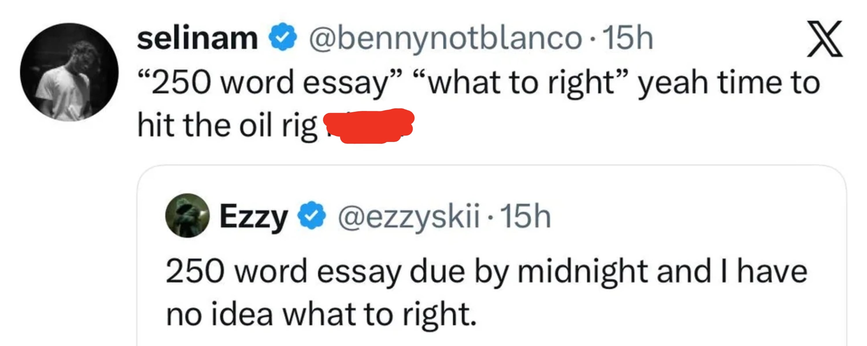 "'250 word essay' 'what to right' yeah time to hit the oil rig."