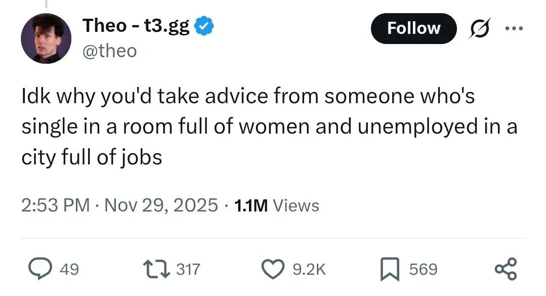 "Idk why you'd take advice from someone who's single in a room full of women and unemployed in a city full of jobs."