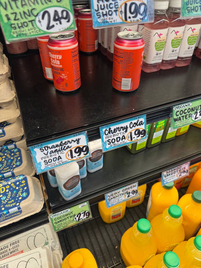 Is there room for Trader Joe’s at the prebiotic soda table? I’m here to find out. I'm a writer based in Brooklyn that covers restaurant and recipe trends for Tasty. The Trader Joe's lineup of prebiotic sodas costs $1.99 a can, while at my local Whole Foods, Olipop costs $2.59 a can. Each category was ranked 1 (awful) to 5 (incredible). For sweetness, however, a 5 means very sweet, and a 1 means not sweet at all (a low score isn't negative; it's just indicative of less sweetness).