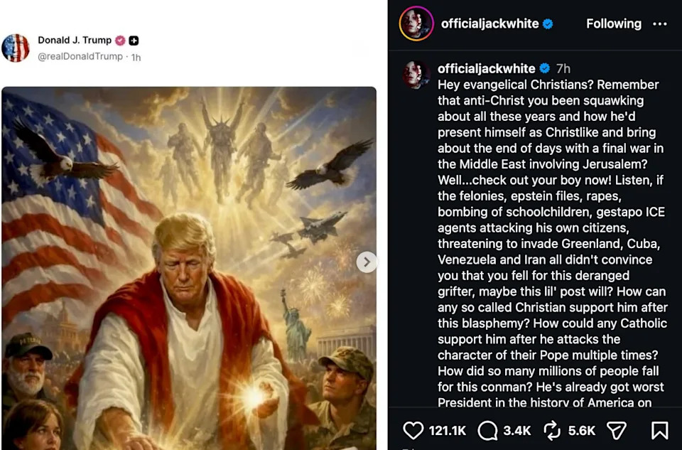 The musician, whose hit “Seven Nation Army” has been streamed more than 2 billion times, also referenced the backlash to Trump’s post from some religious Republicans like Riley Gaines (“looks like SOME christians actually take their own religion seriously”).