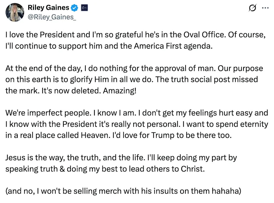 President Donald Trump has called it quits on one of his former allies. The 79-year-old publicly hit back at conservative activist Riley Gaines after the former swimmer criticized the president’s post depicting himself as Jesus Christ. Gaines wrote on X that she was stumped by the president’s move and suggested Trump seek “humility.” “Why? Seriously, I cannot understand why he’d post this. Is he looking for a response? Does he actually think this?” Gaines, who gained fame in the MAGAverse for her loud opposition to transgender athletes in women’s sports, said. “Either way, two things are true,” she continued. “1) a little humility would serve him well 2) God shall not be mocked.” In the face of mounting backlash, including from his own supporters, the president deleted the post and claimed that he thought it depicted him as a doctor, not Christ. When asked by CBS’ Norah O’Donnell if he deleted the post because of the negative response from Gaines and other conservatives, the president replied, “I didn’t listen to Riley Gaines. I’m not a big fan of Riley, actually.” Gaines was quick to respond to the president’s dismissal, writing on X that despite his public rebuke, she would continue to support his agenda. “I love the President and I’m so grateful he’s in the Oval Office,” she wrote. “At the end of the day, I do nothing for the approval of man. Our purpose on this earth is to glorify Him in all we do.” “The truth social post missed the mark,” she continued. “It’s now deleted. Amazing! We’re imperfect people. I know I am. I don’t get my feelings hurt easy and I know with the President it’s really not personal.” Gaines, who is a devout Christian, added that she wants to “spend eternity in a real place called Heaven” and that she would love for Trump to be there too. The Daily Beast has contacted the White House for comment. Gaines ingratiated herself with MAGA and caught Trump’s attention when she began speaking out against trans athletes in women’s sports after competing against a trans swimmer. In March 2022, Gaines, who was swimming for the University of Kentucky, tied for fifth place with transgender competitor Lia Thomas in the 200-yard freestyle at the NCAA Championships. Despite Gaines’ apparent shortcomings in the water, her star grew as her messaging developed in lockstep with the president’s crusade against trans people in sports. After the race, Gaines, who never went pro as a swimmer, hit the conservative podcast circuit to rail against rules that allowed transgender people to compete against biological women. She became a frequent fixture on the airwaves, appearing on TV shows hosted by MAGA thought leaders like former Fox News star Tucker Carlson. She was even a speaker at the Conservative Political Action Conference in 2022, where she was introduced by Trump. Indeed, Trump praised her as a “tremendous athlete” and a “brave swimmer.” “Riley is just a tremendous athlete,” Trump said while signing an executive order targeting transgender athletes in February 2025, with Gaines in attendance. “I want to thank Riley,” he continued. “She really has been in the forefront. People that aren’t that well-versed in this would say that she was the leader. And great job, Riley. Thank you very much. Appreciate it.” The president posted the AI-generated image of himself as Christ shortly after unloading on Pope Leo XIV for criticizing him in an inflammatory 334-word rant. “I don’t want a Pope who criticizes the President of the United States because I’m doing exactly what I was elected, IN A LANDSLIDE, to do, setting Record Low Numbers in Crime, and creating the Greatest Stock Market in History,” the 79-year-old wrote on Truth Social. The president was incensed by the Chicago-born pontiff’s repeated calls for an end to the Iran war and pleas for peace. In addition, he confirmed to CBS News that he had watched Sunday night’s episode of 60 Minutes featuring three American cardinals criticizing his policies prior to his posting spree. Responding to the president’s attacks, the pope said, “I have no fear of the Trump administration, or speaking out loudly of the message of the Gospel, which is what I believe I am here to do.” Asked about Truth Social specifically, the pope said, “It’s ironic — the name of the site itself. Say no more.”