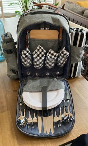Promising review: "This thing is awesome. If you like having a picnic on a bike ride, hiking, around town, etc., this is a great little bag to have. Love the sturdy, non-plastic cutlery and the ability to have dry storage, wet storage, and wine cooler. Blanket is a little small but not bad for two people. Highly recommend." —Mike A