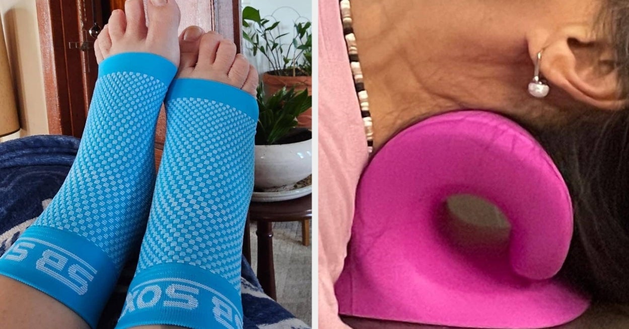 We hope you love our recommendations! While every product is independently chosen by our editors, BuzzFeed and our publishing partners may collect a share of sales or other compensation from the links on this page. You can read more about how our affiliate partnerships work in our Editorial Standards & Ethics Guide. Fear not, these items are gonna help make life a little more comfortable. Please note that these aren't medical recommendations. Be sure to check with your doctor before starting any kind of treatment. Promising review: "Do not hesitate to try this product if you have a hard skin problem on your feet. It takes a few days to see a difference, but now I can see a change. Just like that, the skin on my pinky toe is not rock solid anymore. Bye bye, pain — and I am not joking." —Majda Get it from Amazon for $9.99 (also available as a two-pack). If you have any neck or back issues, talk to your doctor before use and read more about cervical traction at Cleveland Clinic. For this, instead of like a regular pillow, you're supposed to lay on it in 10-minute intervals; the seller suggests working your way up to it by starting yourself off at five minutes at a time, with a one- to three-day adjustment period before regular use. Promising review: "This neck relaxer is so easy to use! It took a few times to get used to, but it is not uncomfortable and is very much helpful with my chronic neck pain and shoulder tension. I felt pain relief after the first use! I have even been able to cut back on my chiropractor appointments because of this product. So thankful for this amazing find as I am only 41 and have been struggling with neck pain for several years now." —Mary Beth Get it from Amazon for $19.99 (available in five colors). Promising review: "FINALLY, COMFY PANTIES! As a 30-year-old woman, I’ve been on the search for comfy underwear and I finally found them. They’re soft and have the perfect amount of stretch." —Amazon Customer "So freaking comfy. I need my undies to cradle under my butt cheeks the way a loving mother tenderly cradles her newborn’s face. I was worried these would creep up the cheeks into wedgie territory, but no. Blissful cheek hugging all day long. Can’t feel them even if I tried. No weird pinching or odd areas. Perfect chef’s kiss. I typically wear Aerie boy brief–style undies — these are a close match in fit and comfort, and equivocal in size." —Ali Morey Get a set of five from Amazon for $19.99+ (available in women's sizes XS–3XL and in 12 color combos). Read more about aromatherapy and stress and tension at Johns Hopkins. Basic Vigor is a US-based small business specializing in all-natural migraine relief products. Promising review: "I’ve had migraines all my life — I’m 31 now. I’ve been on all kinds of prescriptions that work, but make me so sleepy... I’ve been using this stick for one week now, and it’s amazing! I rubbed it on at the first hint of a headache/migraine and it takes care of it fast. I haven’t taken a prescription migraine since I started using it." —Amanda Braswell Read BuzzFeed's review of the migraine stick for more deets! Get it from Amazon for $12.95 (also available in a three-pack). Read more about how temperature therapy can help with migraine prevention at Mayo Clinic. Y'ALL! I've been a chronic migraine sufferer for years so I was skeptical that this ice pack would be any better than others I've tried. Thankfully, I was wrong. It's not flimsy at all and has some good weight to it while still being super soft and flexible. In addition to 360-degree cold (or heat!) therapy, it also provides *gentle* compression that's wonderfully soothing when a headache hits. You can pull it all the way down to cover your eyes (🎶 hello darkness, my old friend 🎶) or push it slightly upward to sit on your forehead, which means you'll still be able to see and do things if needed. I also LOVE not having to balance an ice pack on my forehead while trying to get some relief. The included freezer bag keeps it nicely contained so it doesn't come out smelling like all the frozen foods it's stored with. Promising review: "I heard about it on TikTok, and I was skeptical. I put it in the freezer as soon as I got it in the mail. Then, out of nowhere, I felt a headache coming on. I pulled it out of the freezer, slipped it on, and I passed out. When I woke up, my migraine was gone. I now go to bed with it on almost every night. I love that it's a blackout mask. I HIGHLY RECOMMEND!!!!" —TheWalkFam Get it from Amazon for $29.95+ (available in six colors). You'll also get two 8-inch extension straps and a 28-inch strap for creating a unique-to-you fit! Promising review: "The cordless knee massager with heat provided excellent relief prior to my total knee replacement. Since my TKR, I’ve been enjoying the comfort of the massage feature as my knee heals from surgery. This product stays charged for a long time and is portable, so it can be used while traveling or working. My only regret is not finding this product sooner. It's great and works well." —Donna Get it from Amazon for $59.99 (also available individually). Patellar tendon straps like this one can reduce strain on the tendon connecting your kneecap and tibia during physical activity. While this can help reduce pain, talk to your doctor about recurring pain so you can address any underlying issues. Learn more about patellar tendon straps at Cleveland Clinic, and chat with your doctor to see if this is right for your knee pain. Promising review: "This brace works like magic. I purchased it to help with knee pain from cycling, and I just make sure it's on tight and just underneath my patella and I have zero pain or discomfort now. Would definitely recommend. Comes with two braces!" —Amazon Customer Get a two-pack from Amazon for $9.99+ (available in two sizes and four colors). Note: The person above is wearing the "Lifts" style. Promising review: "I’ve tried so many