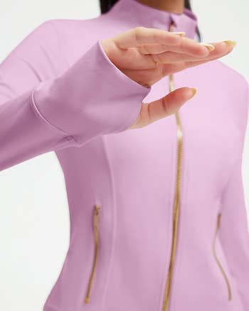 Promising review: "Such a great workout jacket. Fits perfectly, snatches you up, it’s true to size, has some stretch and very comfortable. It’s very similar to the Lululemon Define Jacket Nulu but for a better price. The color is beautiful. I bought two of them the pink and the ivory one. Totally recommend it, you won’t regretted." —Motas