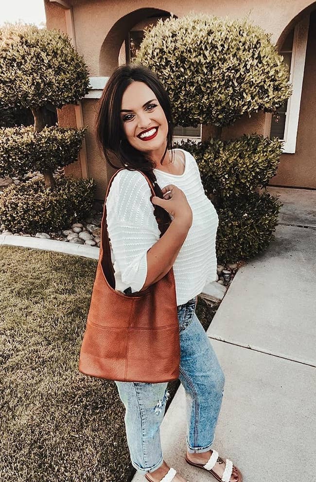 Promising review: "I bought this bag looking for something similar to 'that one brand' that was affordable. This bag is absolutely gorgeous and looks identical. When I opened the box, it smelt a bit weird, but I took a leather cleaner/conditioner to the bag with a microfiber cloth, and it no longer smelt, and she looked nice and shiny. It took me a while to figure out how to organize my things as it is a unique shape, but once it was organized, I loved it." —lisa keegan