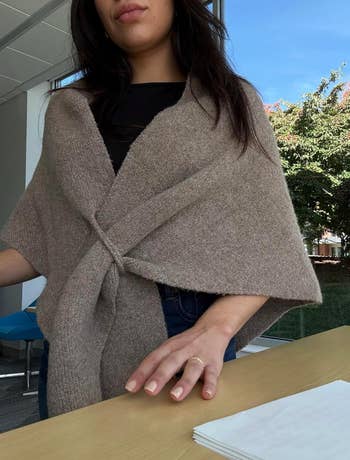 Promising review: "This shawl is the best!!! It feels so comfortable on and is soooo soft! I ordered khaki and black. I may have to go back and order the white as well. It will be perfect at the movies, on a plane, at the mall, or in a store when you don't want to wear your jacket, dressed up with a little dress when you need a little something for warmth or style!! Love that you don’t have to tie it and make it too bulky, you just slip the end through the slot and it fits perfectly!!" —Nana Beth