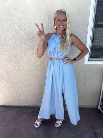 Promising review: "I absolutely love this dress! It’s comfortable but also looks chic. I feel like it could be easily dressed up or down. I’ve worn mine as a halter and regularly tied as pictured. It does run a bit large so I would size down if you’re in between sizes. I ordered another color after receiving mine because it’s so great!" —Ally Estergard